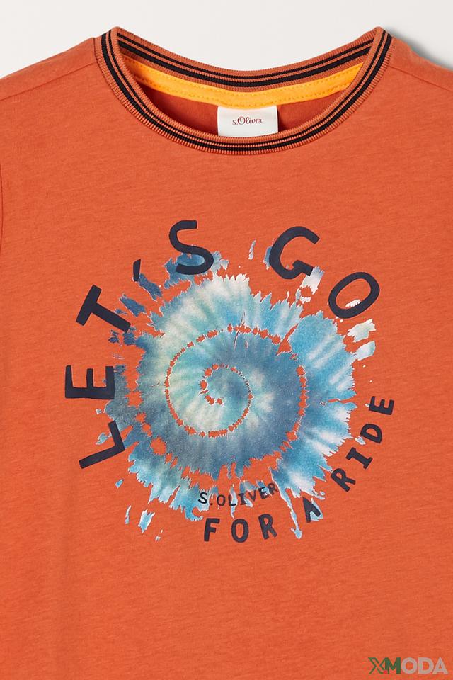 Эта яркая футболка от s.Oliver станет отличным дополнением к гардеробу вашего мальчика. Футболка выполнена в оранжевом цвете и украшена оригинальным принтом в виде спирали, выполненной в технике тай-дай, с надписью "LET'S GO FOR A RIDE".