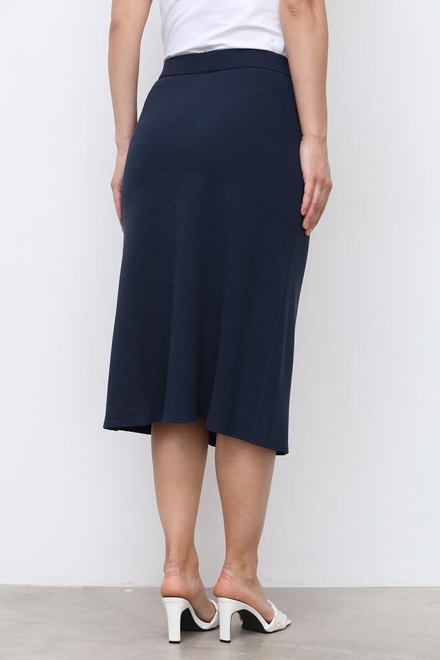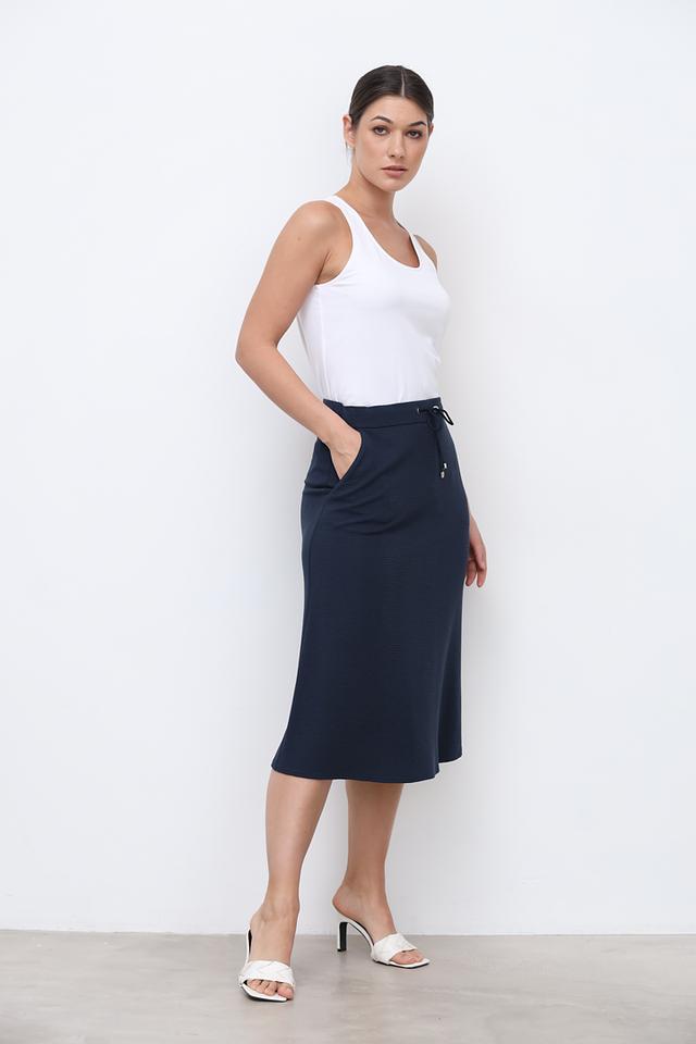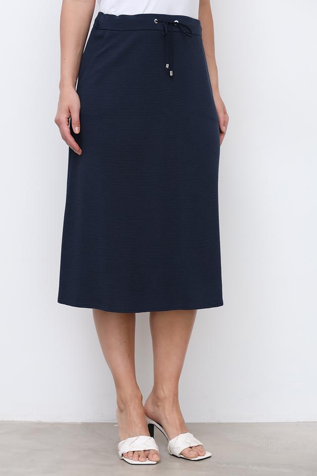 Тёмно-синяя юбка Sommer mann из текстурированной ткани. Модель миди-длины с эластичным поясом и боковыми карманами, дополнена шнурком для регулировки посадки. Состав: вискоза 60%, полиэстер 35%, эластан 5%