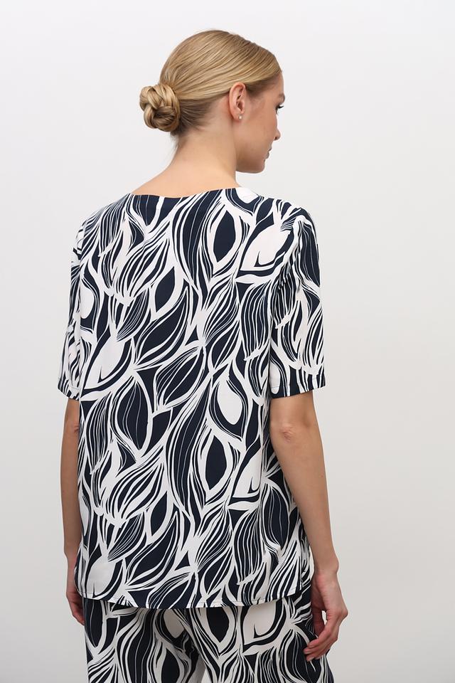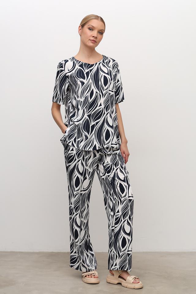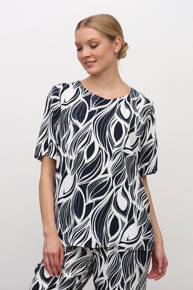 Особенностью этой блузы является ее уникальный черно-белый принт с абстрактным рисунком, который придаёт ей особый шарм и стиль. Блуза отлично сочетается с брюками, юбками и джинсами, позволяя создавать разнообразные образы.