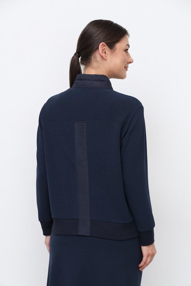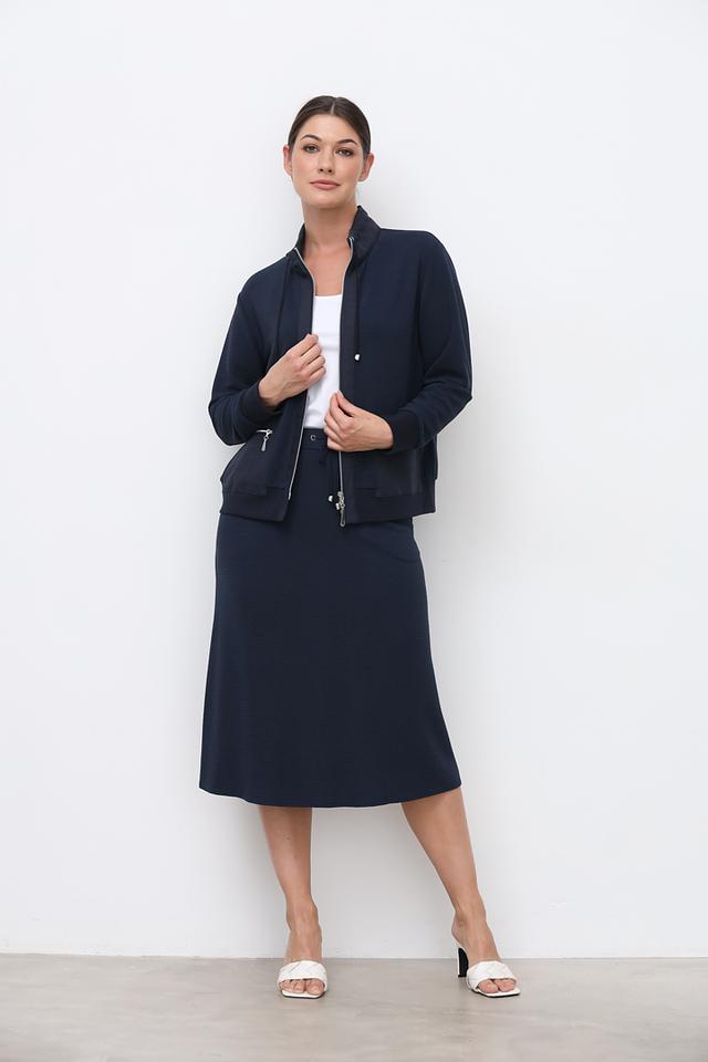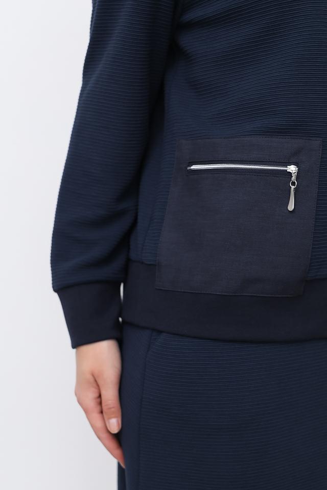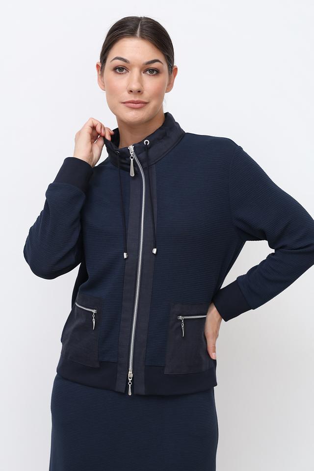 Синий жакет Sommer mann приталенного силуэта с застежкой на молнию и капюшоне. Модель выполнена из фактурной ткани с добавлением вискозы, полиэстера и эластана, что обеспечивает комфорт и удобство в носке. Состав: вискоза 60%, полиэстер 35%, эластан 5%