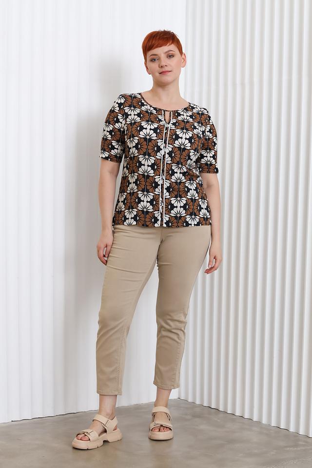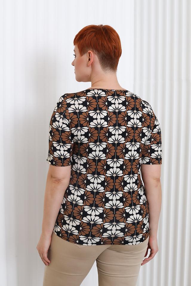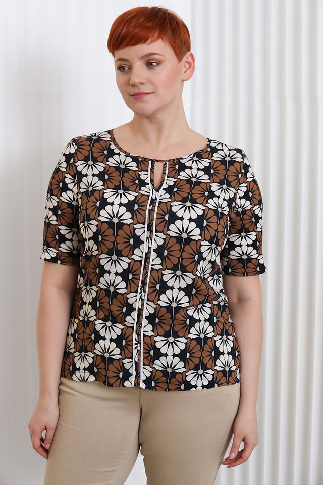 Основной цвет блузы – чёрный, а принтом служат крупные белые и коричневые цветы. Короткие рукава делают эту блузу идеальным выбором для теплой погоды. Состав: 96% вискоза, 4% эластан.
