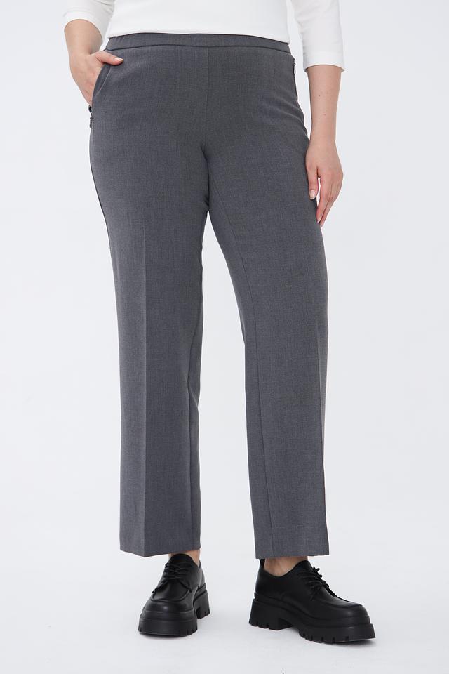 Брюки имеют прямой крой и стандартную посадку по талии. Эластичный пояс обеспечивает комфортную посадку по фигуре. На брюках предусмотрены боковые карманы и задние карманы с молниями.