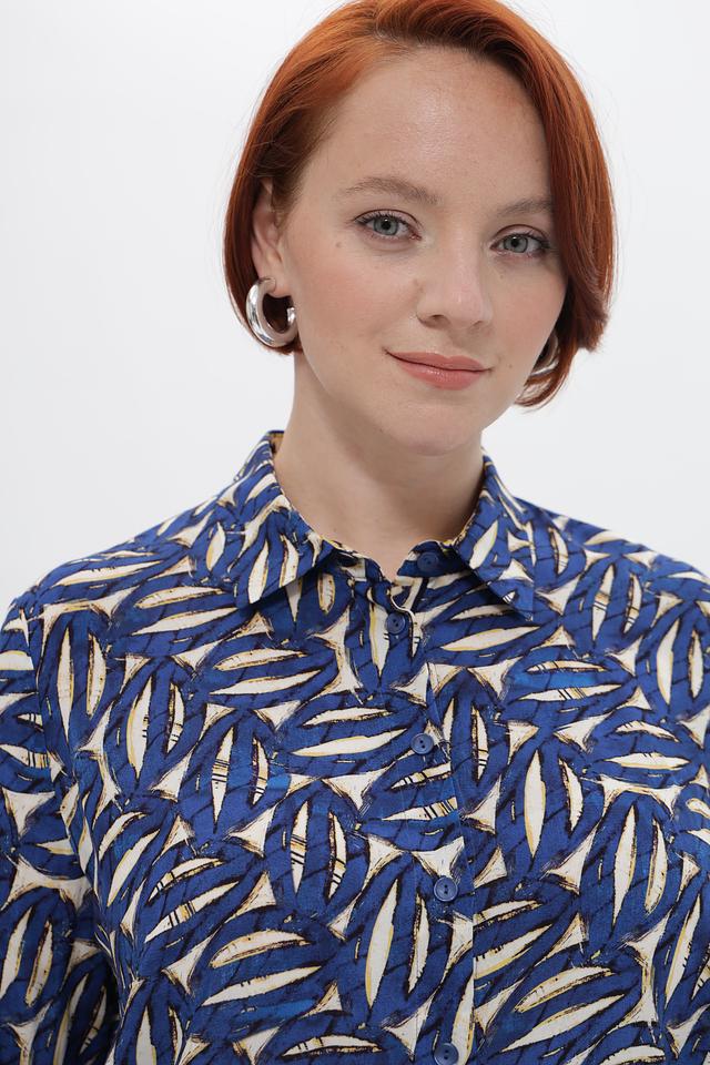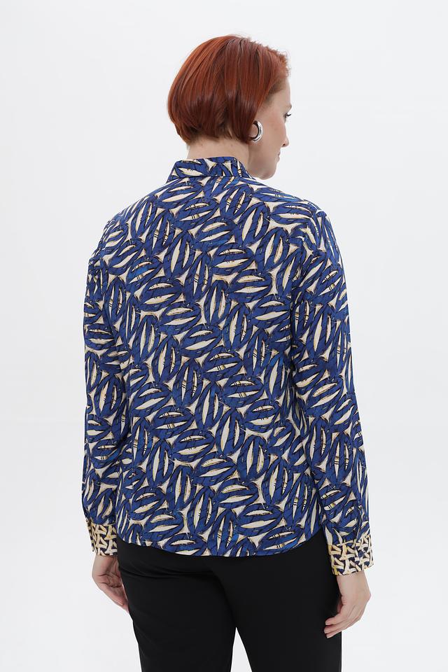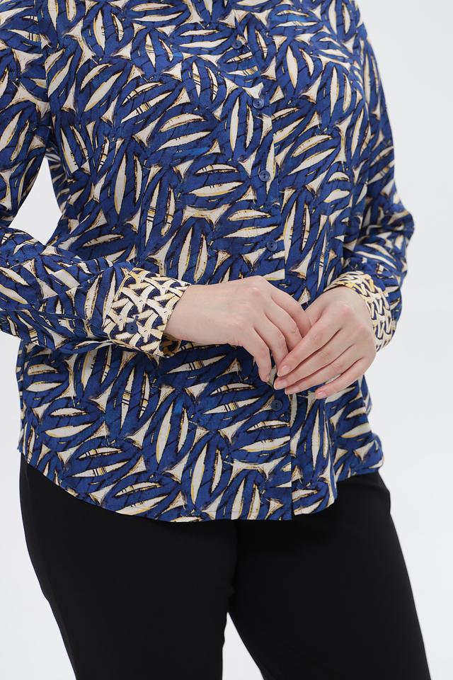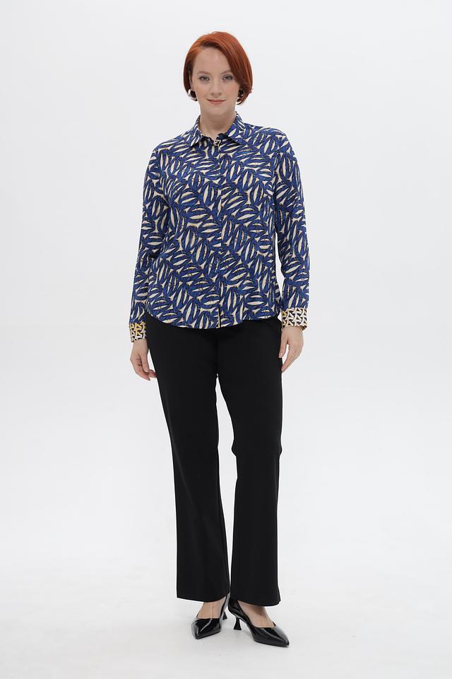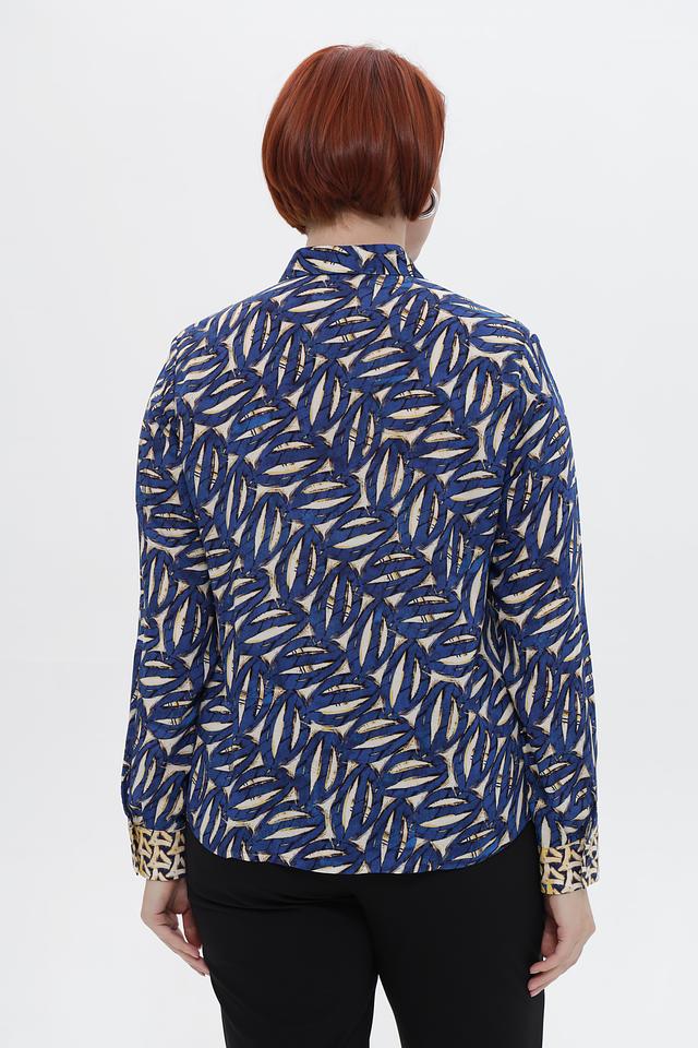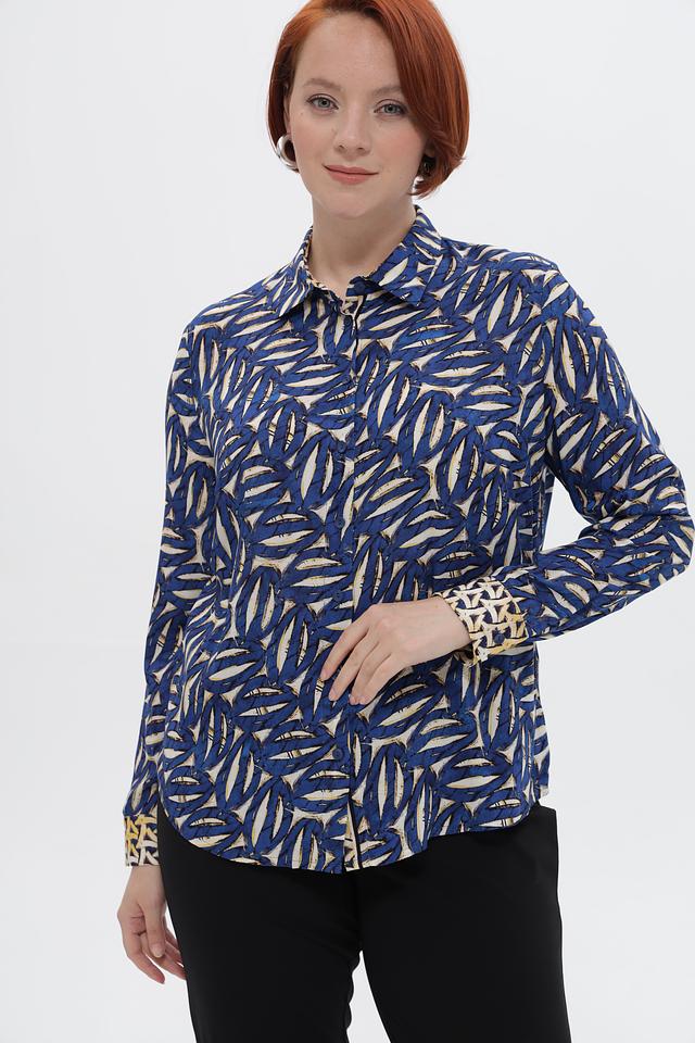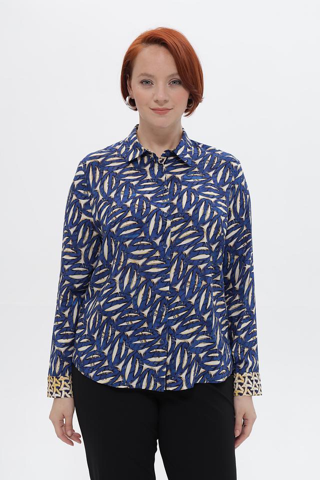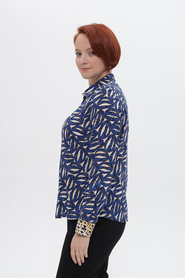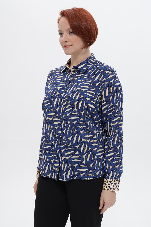 Дизайн блузки отличается ярким принтом, добавляющим образу индивидуальности. Классический воротник и длинные рукава с манжетами на пуговицах придают блузке изысканный вид.