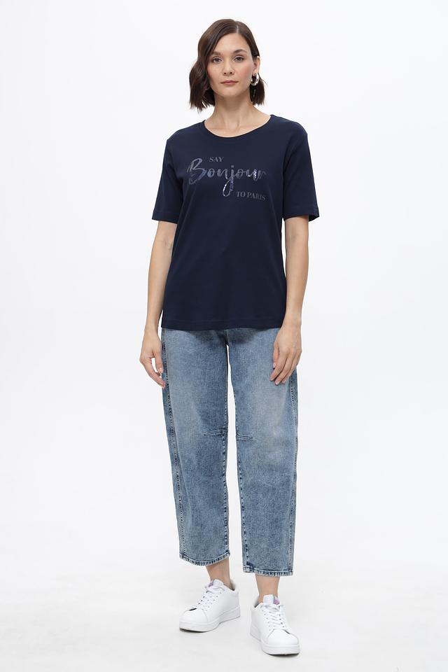 Синяя футболка Steilmann из 100% хлопка с эффектным принтом "Bonjour to Paris". Базовый крой и натуральный состав обеспечивают комфорт в повседневной носке. Состав: хлопок 100%