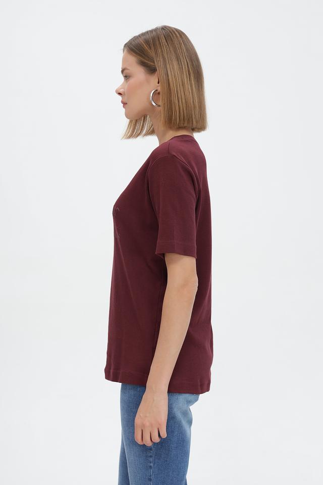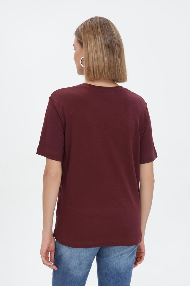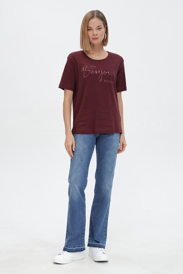 Модель оформлена круглым вырезом горловины и короткими рукавами. Центральным элементом дизайна является яркий принт с надписью «Bonjour to Paris», выполненный в бордовом цвете в тон изделию, что придает футболке стильный и современный вид.