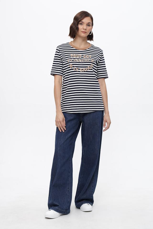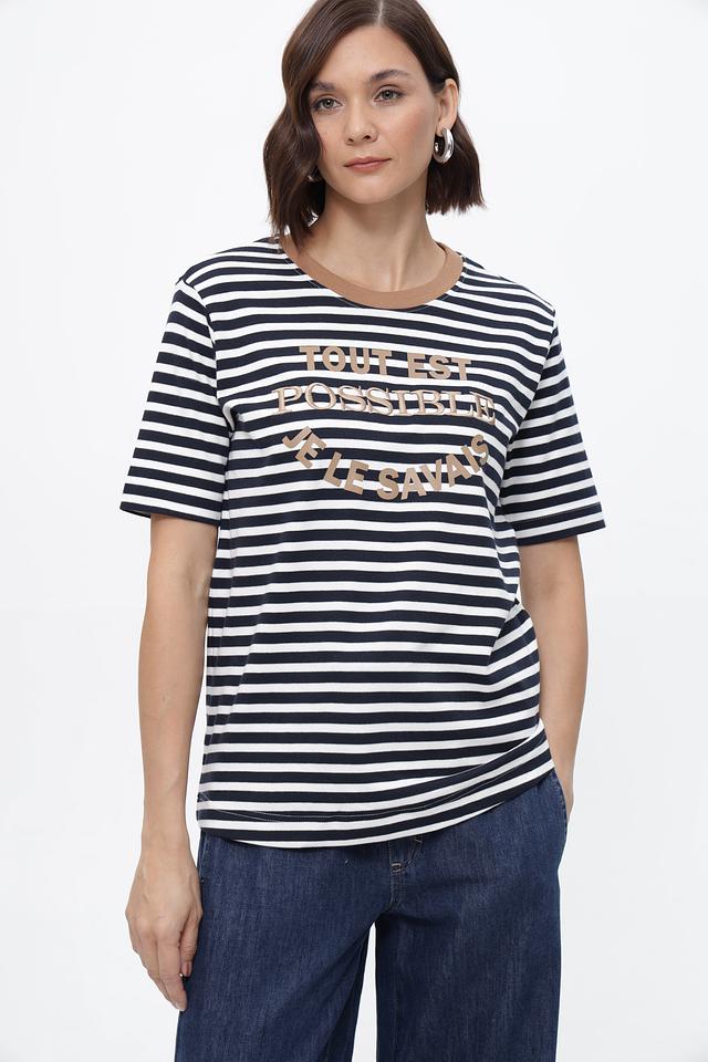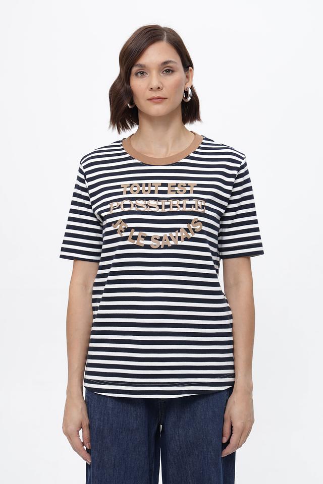 Женская футболка Steilmann синего цвета в классическую полоску, декорирована золотистой надписью. Изготовлена из 100% хлопка, обеспечивающего комфорт и воздухопроницаемость. Состав: хлопок 100%