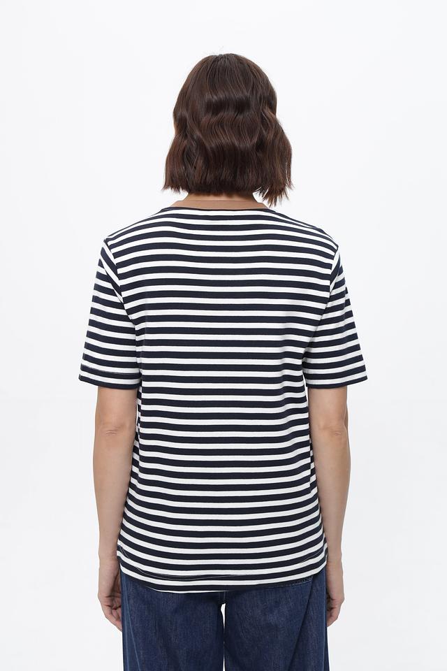 Женская футболка от бренда Steilmann выполнена в классическом дизайне с горизонтальной полоской синего и белого цвета. Модель имеет прямой, слегка свободный крой, который обеспечивает комфортную посадку по фигуре.