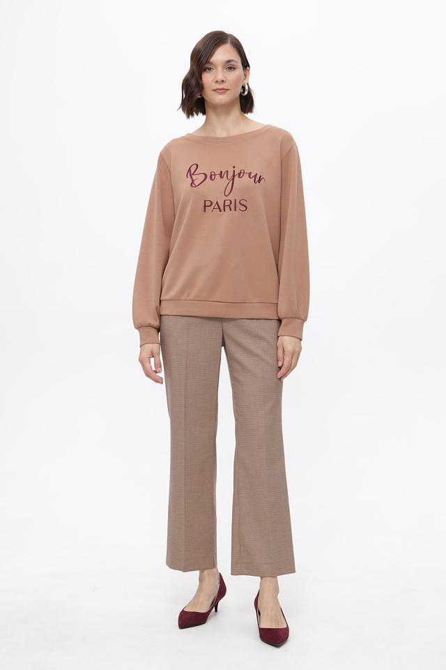 Особый акцент в дизайне пуловера — оригинальный принт «Bonjour Paris», выполненный в бордовом цвете. Свободный крой позволяет чувствовать себя комфортно в любой ситуации. Пуловер легко сочетается с различными элементами одежды, создавая стильные и современные образы.