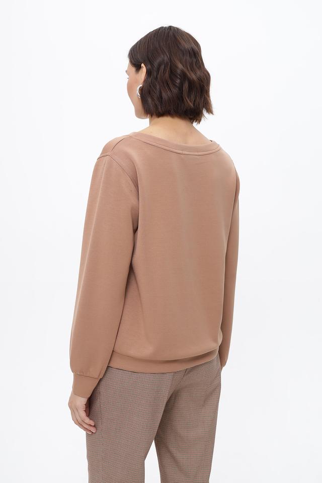 Пуловер выполнен из приятной к телу ткани, сочетающей в себе 65% модал, 30% полиэстер и 5% эластан. Состав обеспечивает комфорт при носке, мягкость и устойчивость к деформации. Модель имеет круглый вырез горловины и длинные рукава.