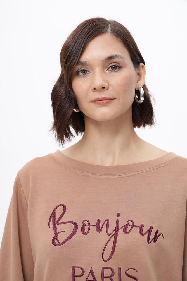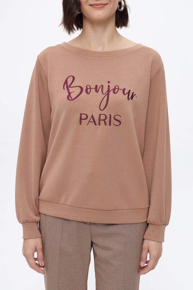 Бежевый пуловер Steilmann с принтом «Bonjour Paris» — стильная и комфортная модель на каждый день. Изготовлен из мягкого модала с добавлением полиэстера и эластана для удобства носки. Состав: модал 65%, полиэстер 30%, эластан 5%