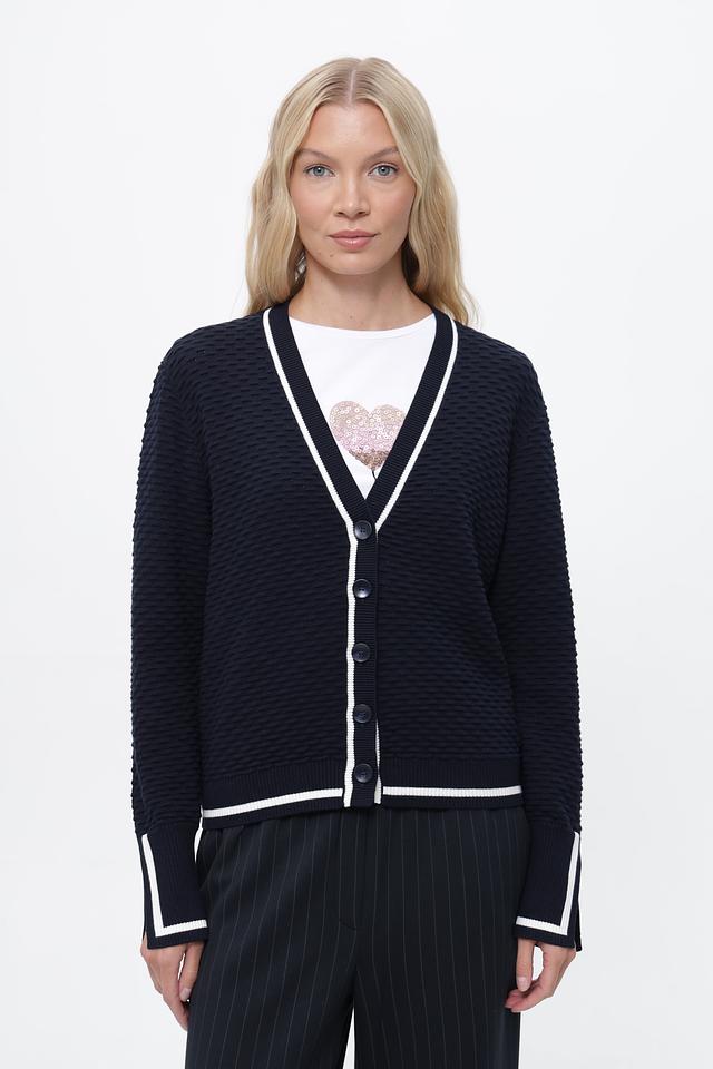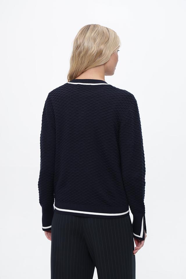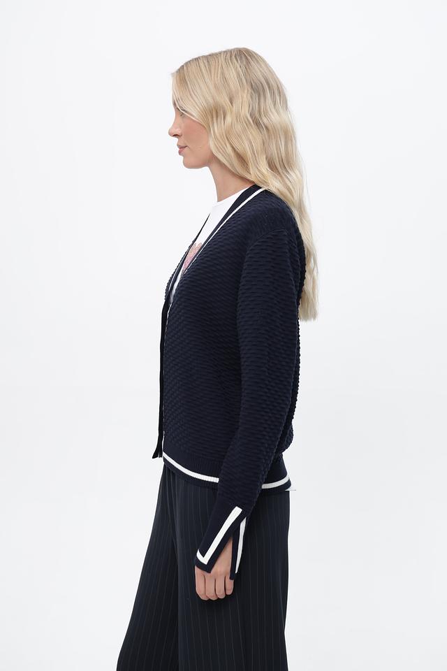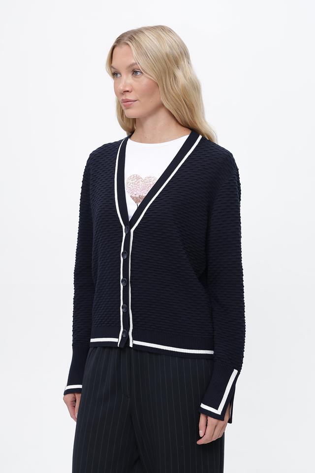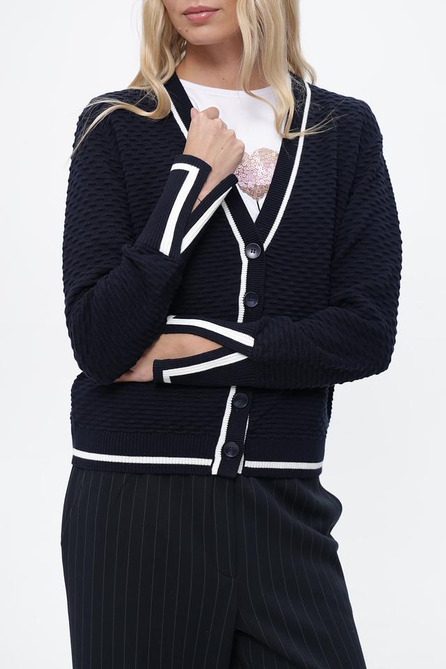 Жакет имеет классический V-образный вырез и длинные рукава, что обеспечивает комфортную посадку по фигуре. Отличительной особенностью модели является контрастная белая полоска, которая проходит по всему периметру изделия, добавляя ему динамичности и свежести. Застежка на пуговицы позволяет регулировать степень прилегания и создавать различные образы.