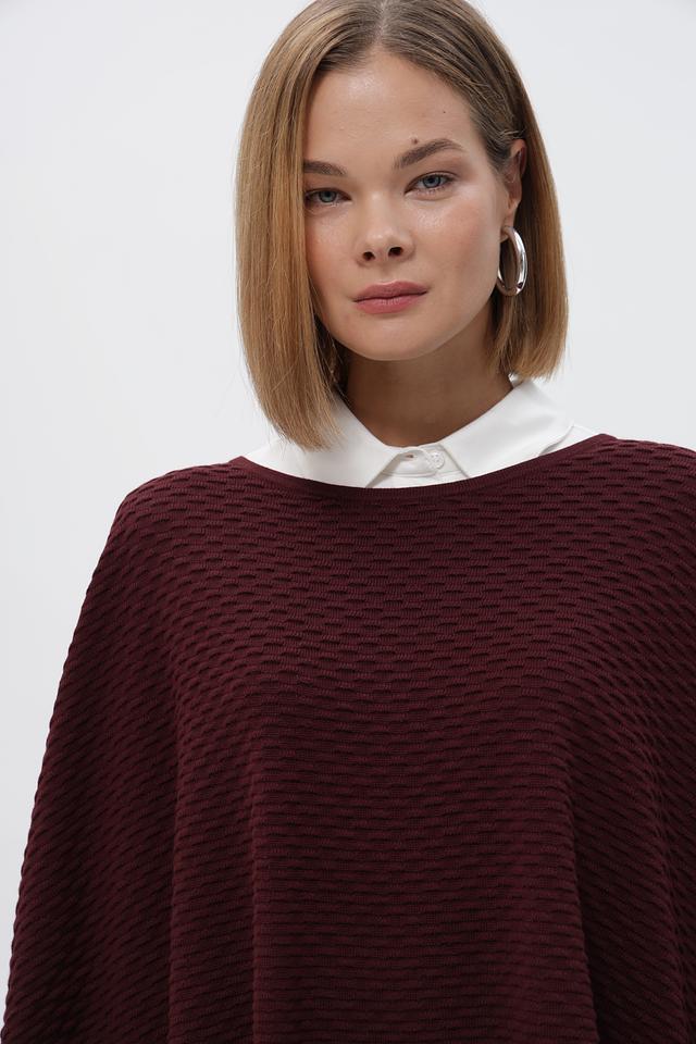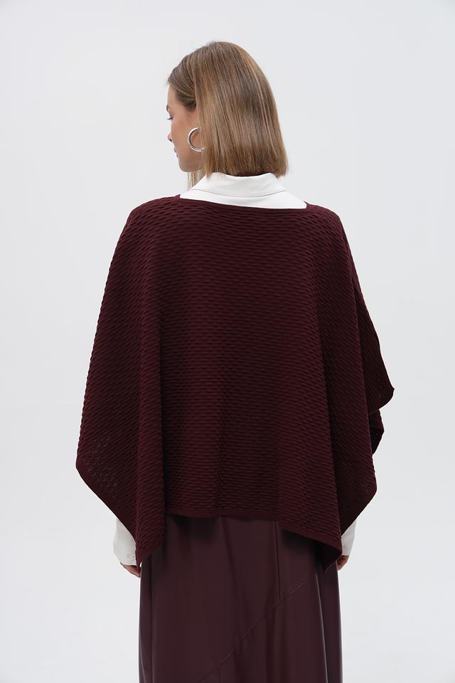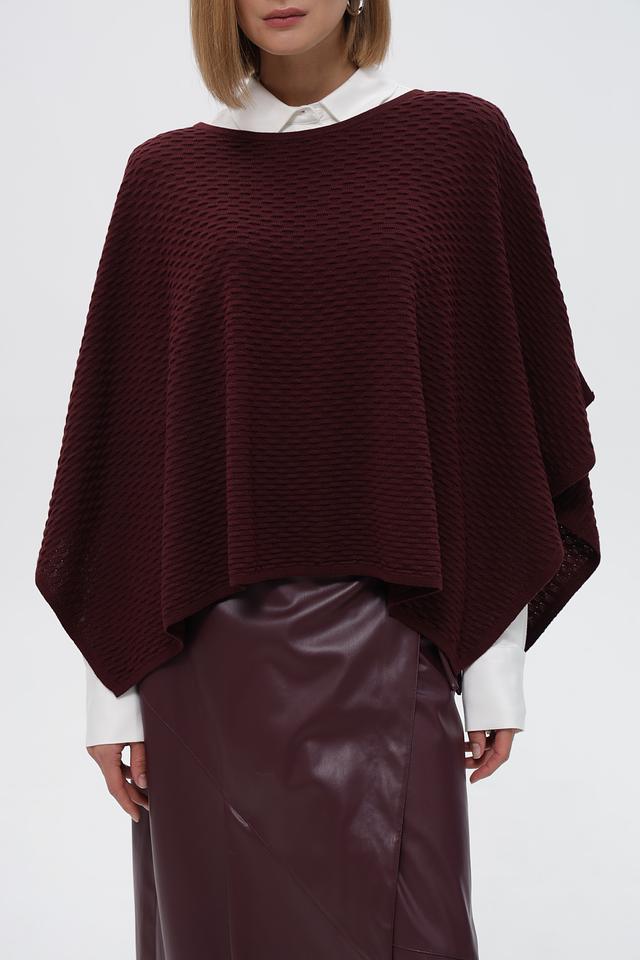 Модель выполнена из мягкого трикотажа, сочетающего в себе 50% хлопка и 50% полиакрила. Фактурная вязка придает изделию объем и оригинальность. Пончо имеет свободный крой и широкие рукава, обеспечивающие комфортную посадку по фигуре.
