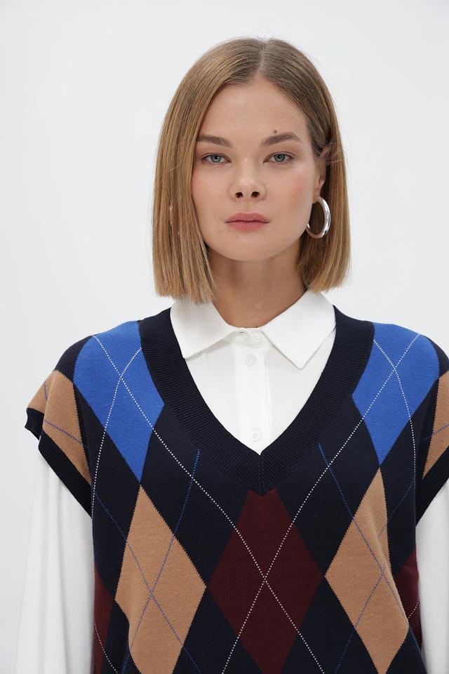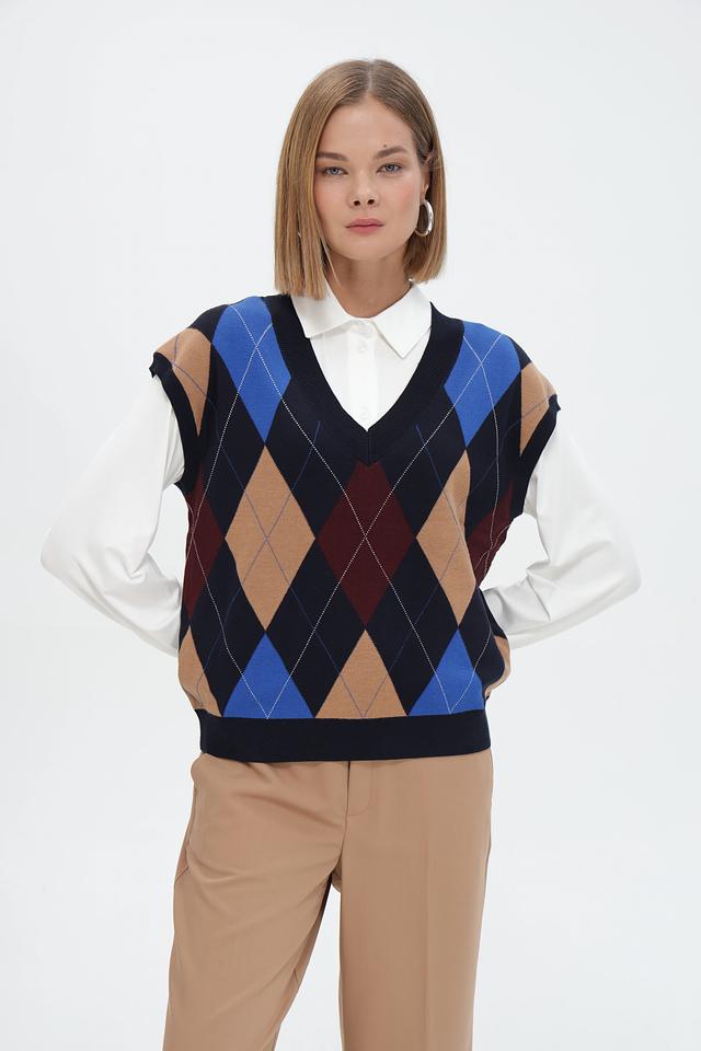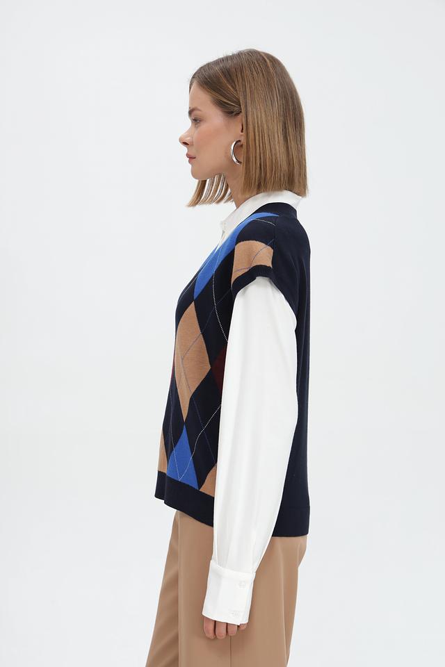 Женский жилет Steilmann – это универсальный предмет гардероба, который добавит изысканности и стиля любому образу. Жилет выполнен в синем цвете и украшен классическим ромбовидным узором в бежевых, коричневых и бордовых оттенках.