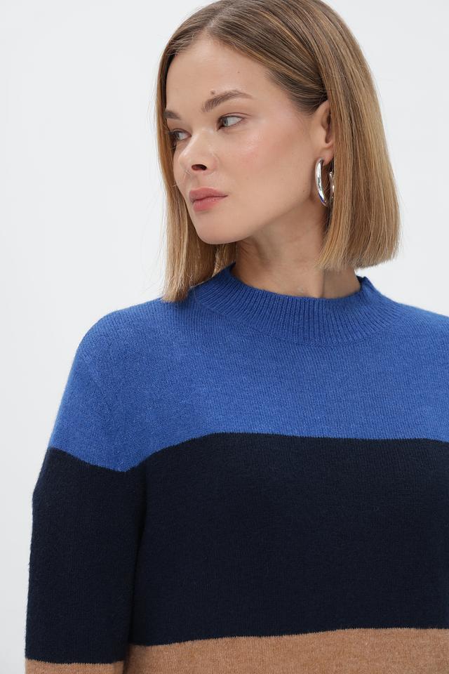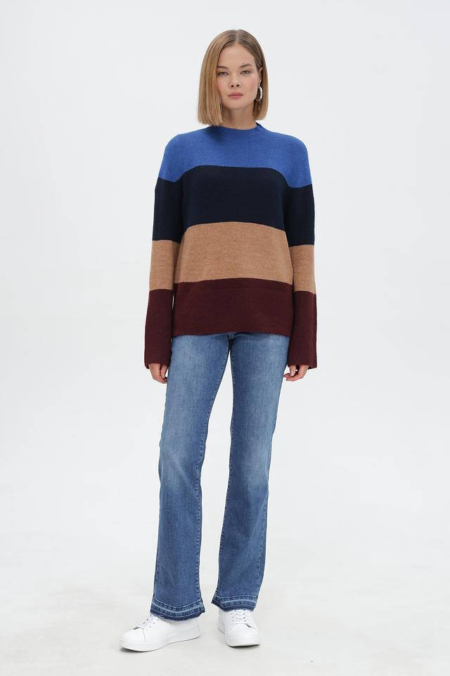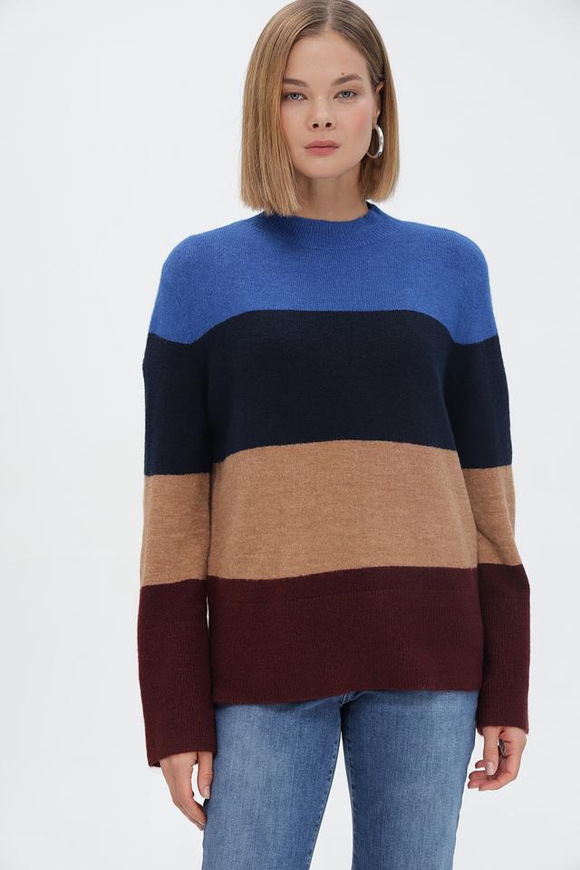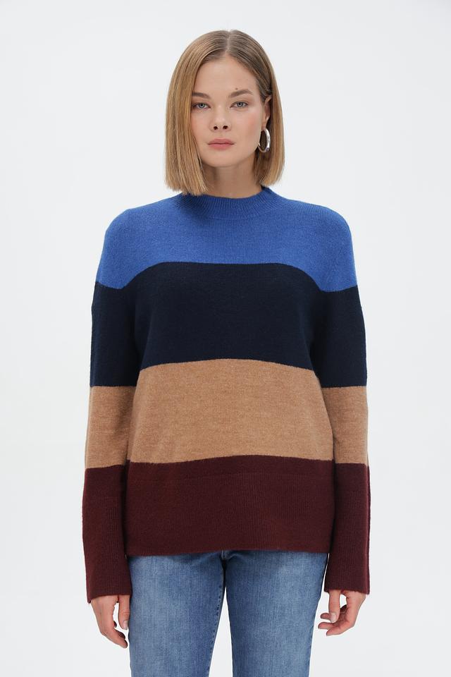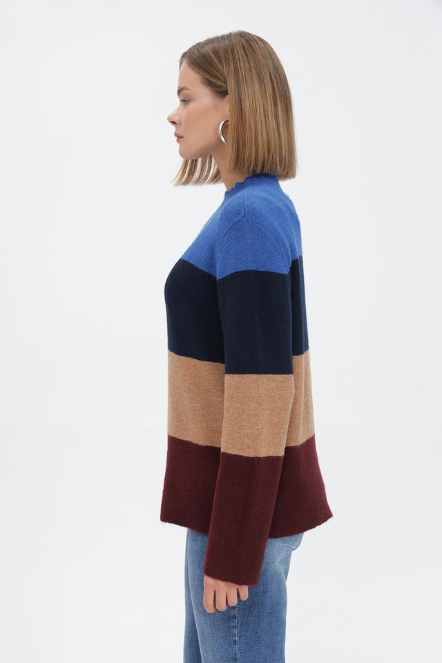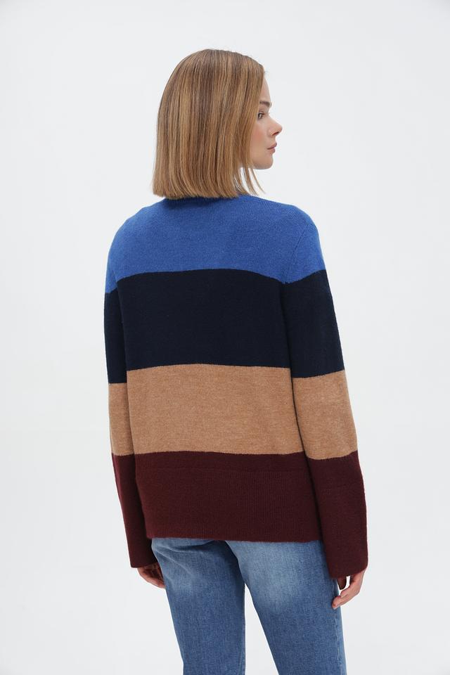 Модель выполнена в оригинальной цветовой гамме с горизонтальными полосами синего, коричневого, бежевого и бордового цветов. Высокий воротник-водолазка придаёт изделию элегантный вид.