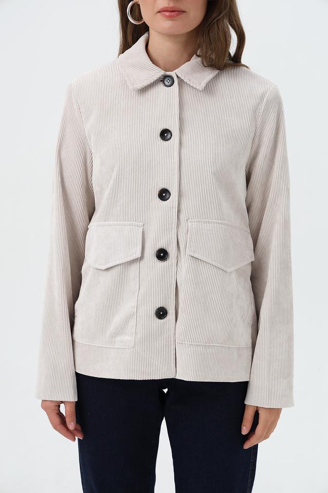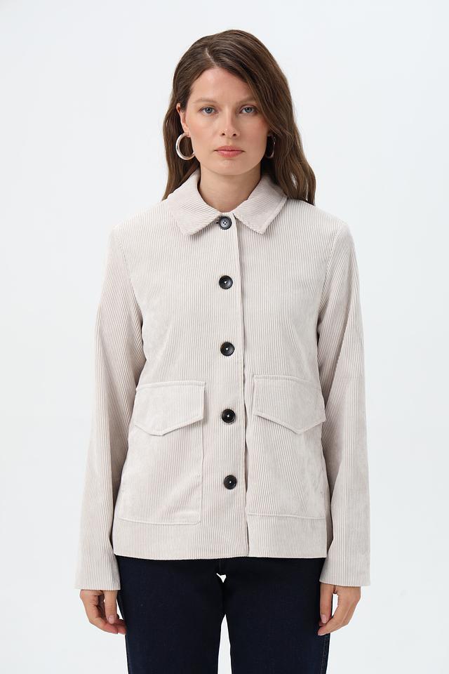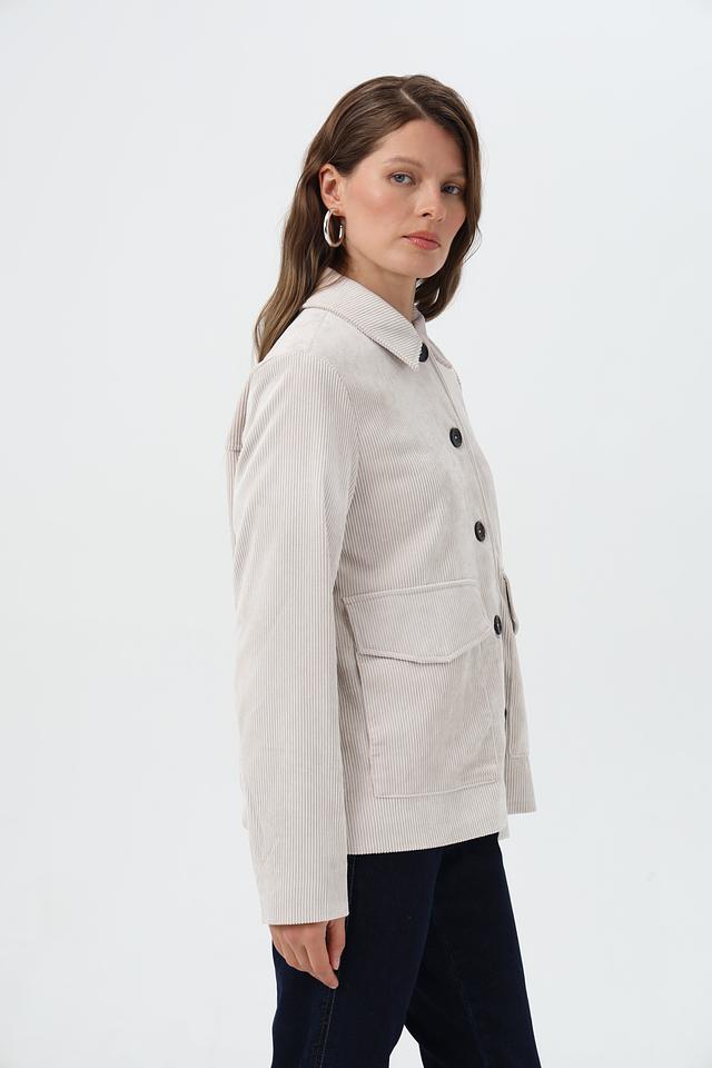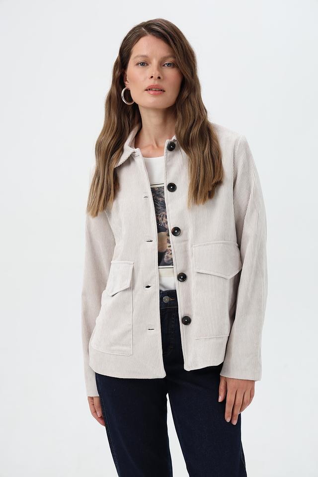 Жакет имеет классический крой с длинными рукавами и отложным воротником. Застежка на пуговицы в тон изделия. На передней части расположены накладные карманы.