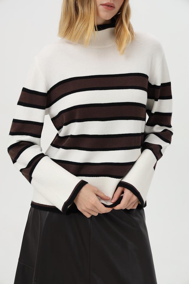 Представляем стильный пуловер от бренда Steilmann. Модель выполнена в белом цвете с горизонтальными полосами чёрного и коричневого оттенков, что придает ей актуальный вид.