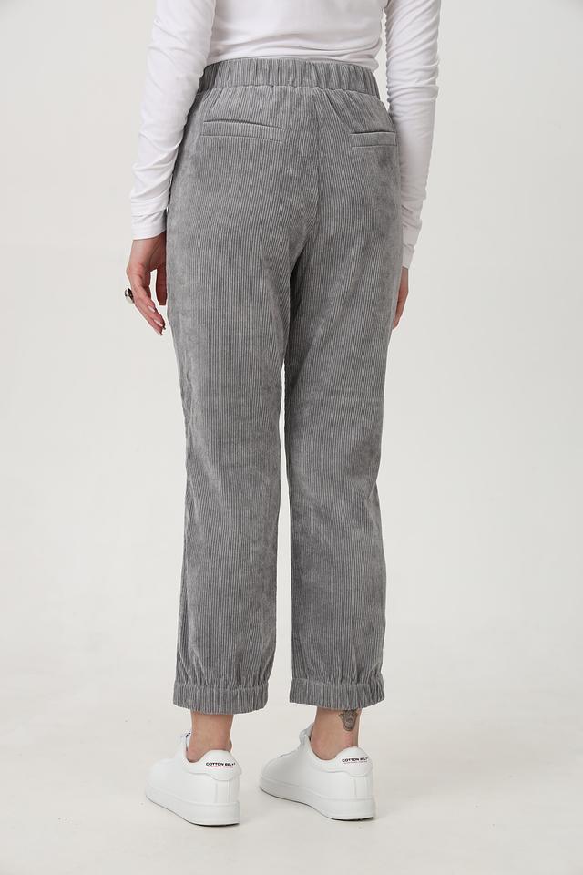 Данная модель выполнена в сером цвете с вертикальной полоской, что визуально вытягивает силуэт. Брюки имеют прямой крой и слегка зауженный книзу силуэт, а также укороченную длину.