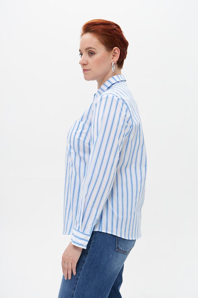 Женская блузка Suza голубого цвета, выполненная в вертикальную полоску. Модель с длинными рукавами и классическим воротником.