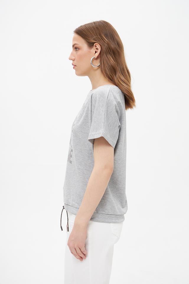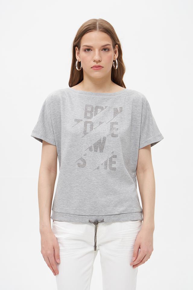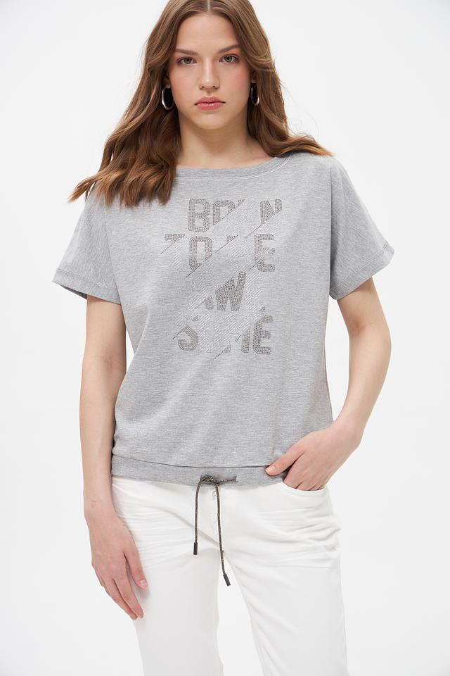 Женская футболка Suza серого цвета, украшенная стразами, выполнена из мягкого трикотажа. Состав: вискоза, полиамид, эластан. Состав: вискоза 60%, полиамид 35%, эластан 5%
