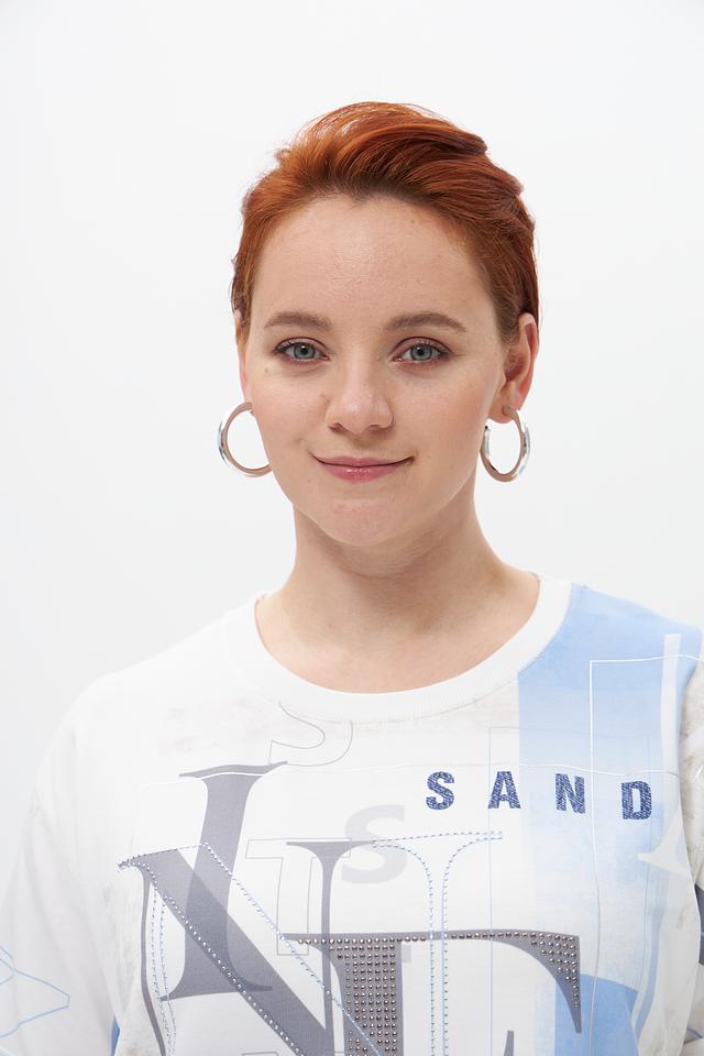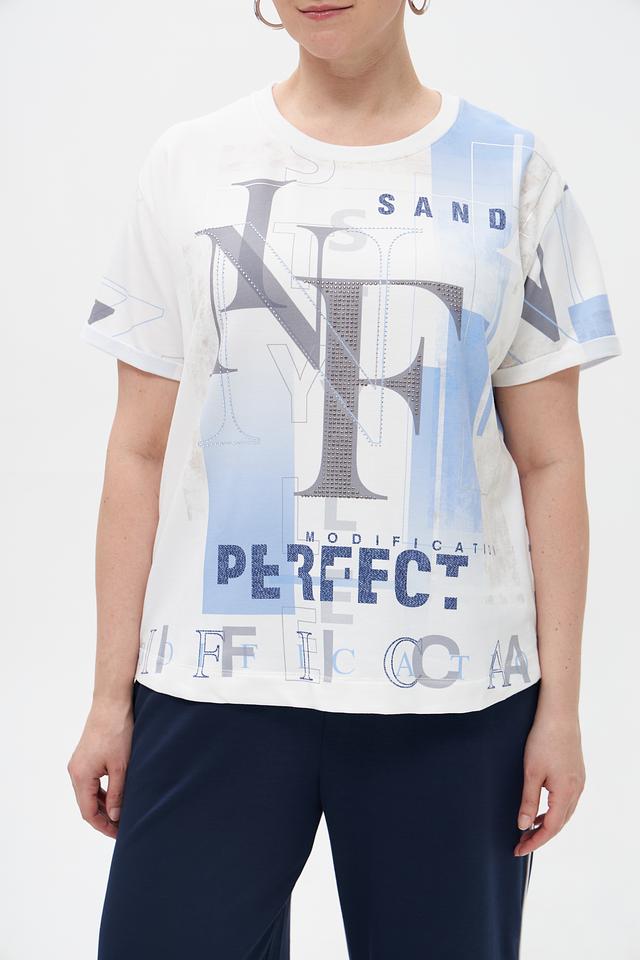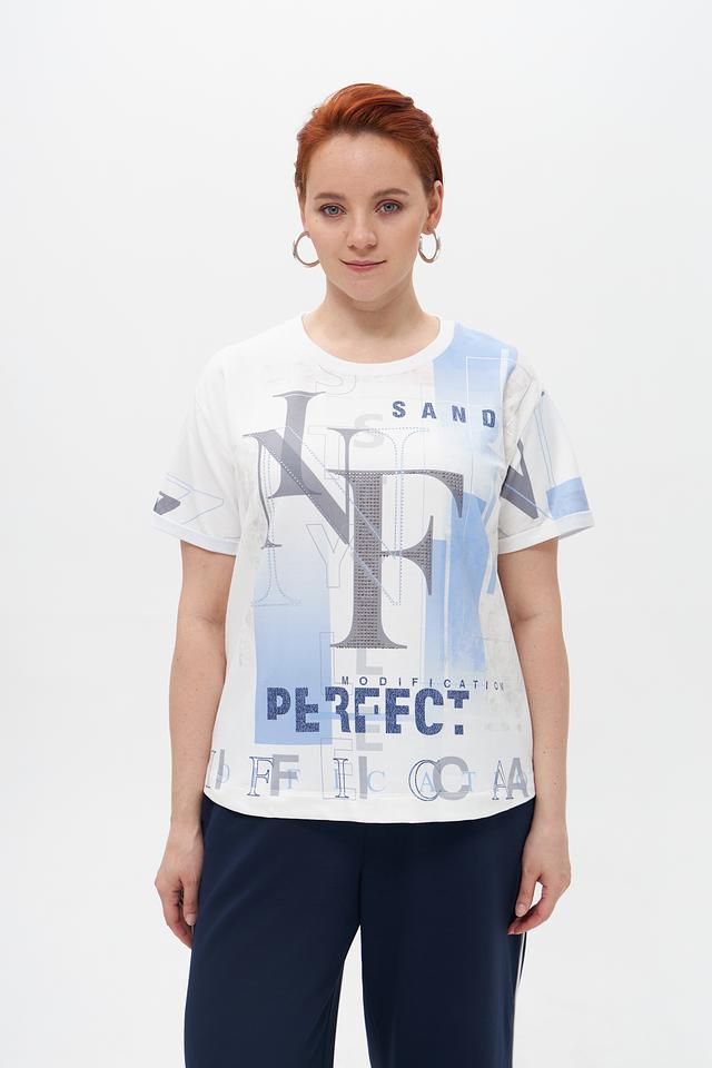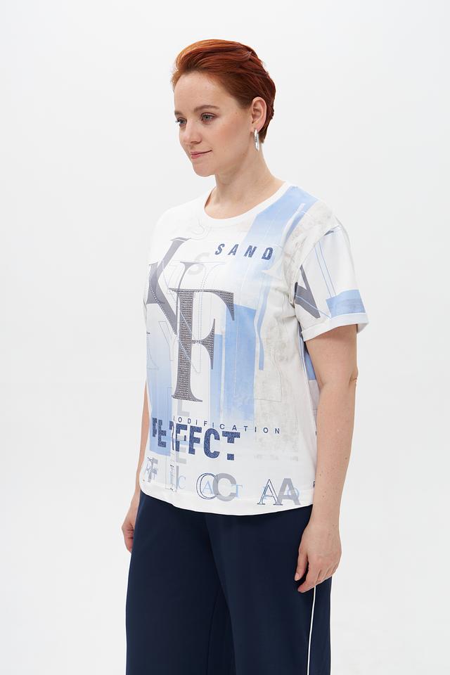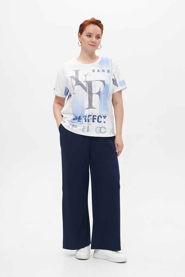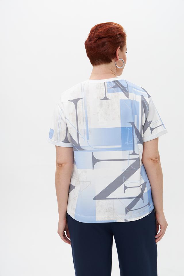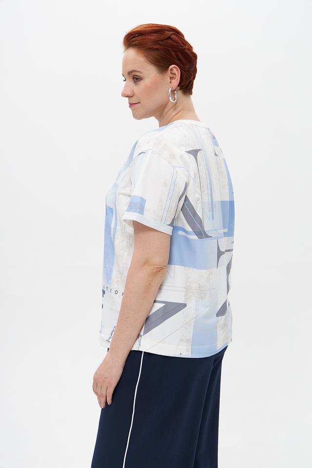 Основной цвет футболки – белый, украшен эффектным принтом с изображением букв "NY" и абстрактными элементами в голубых тонах. Принт добавляет образу динамичности и оригинальности.