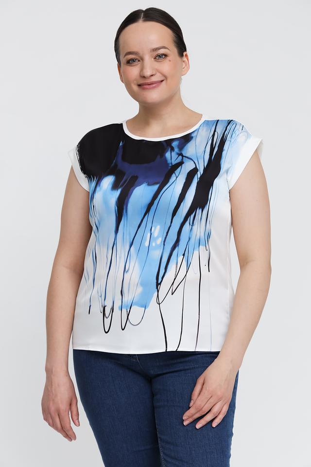 Основной цвет футболки – белый, но её главным акцентом является яркий и необычный абстрактный принт, выполненный в синих и чёрных тонах. Такой рисунок добавит образу оригинальности и индивидуальности.