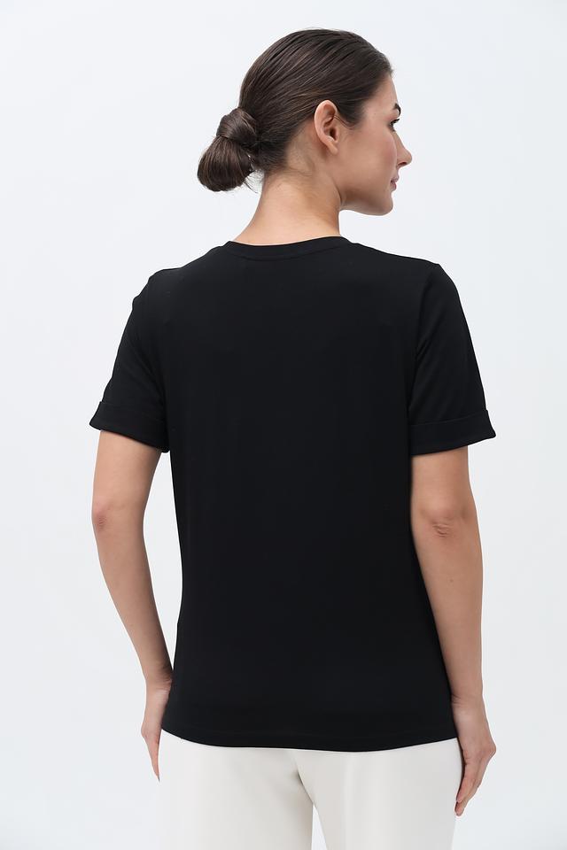 Футболка имеет классический прямой крой, который подходит для любой фигуры. Чёрный цвет делает её универсальной и легко сочетаемой с другими элементами одежды.