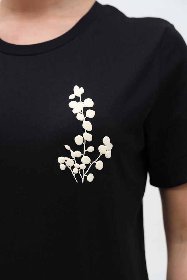 Особый шарм этой модели придаёт деликатный цветочный принт, расположенный на груди. Он добавляет образу женственности и лёгкости. Эта футболка идеально подходит для создания повседневных образов, а также для более нарядных вариантов.