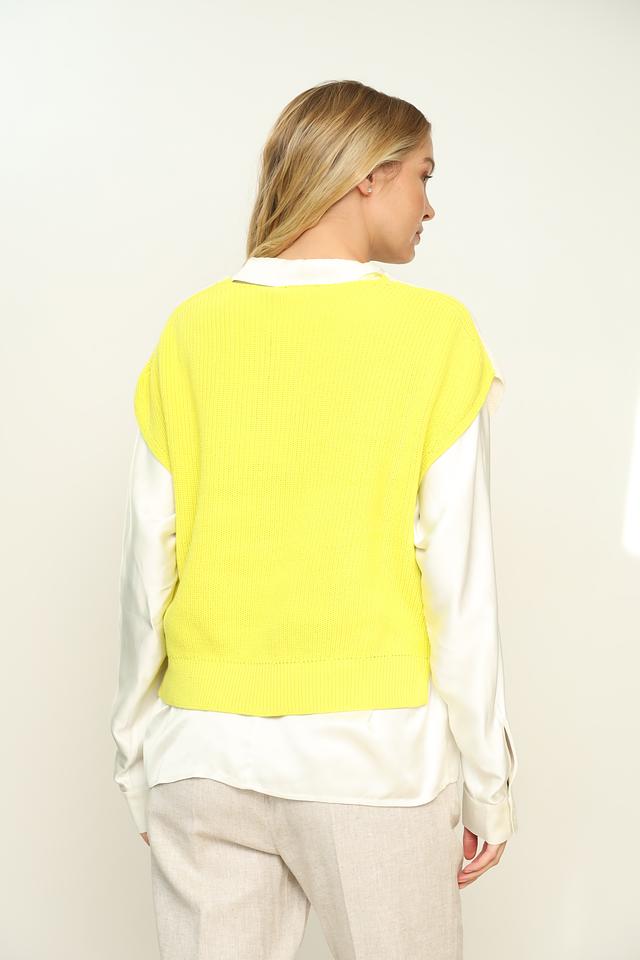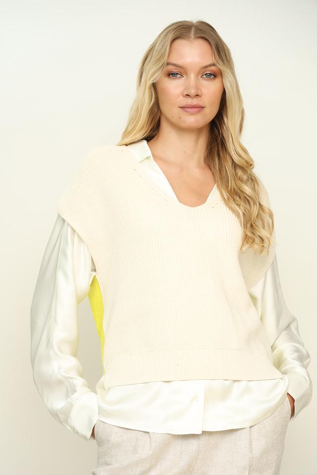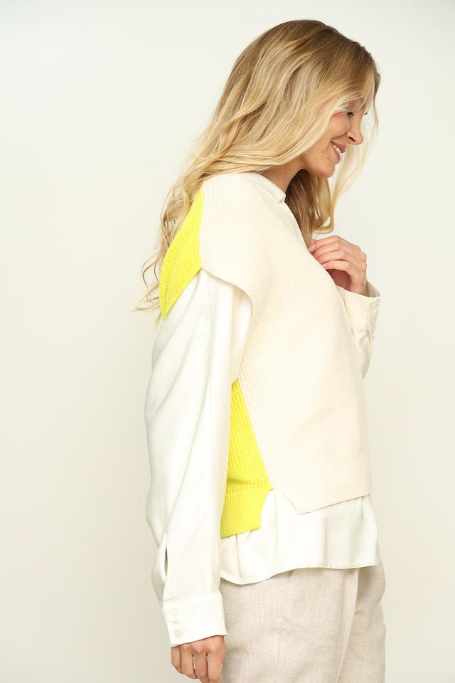 Жилет имеет классический V-образный вырез и вязаную текстуру. Основной цвет – кремовый, а яркий лаймовый акцент придает образу оригинальность и динамичность. Благодаря своему универсальному дизайну, жилет легко сочетается с различными элементами одежды – рубашками, блузками, футболками и брюками.