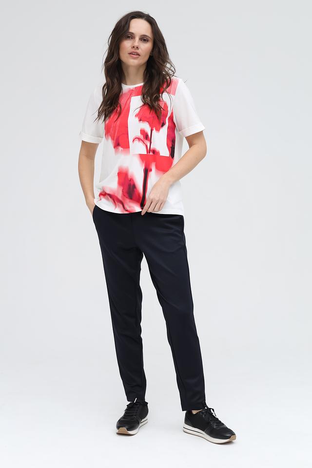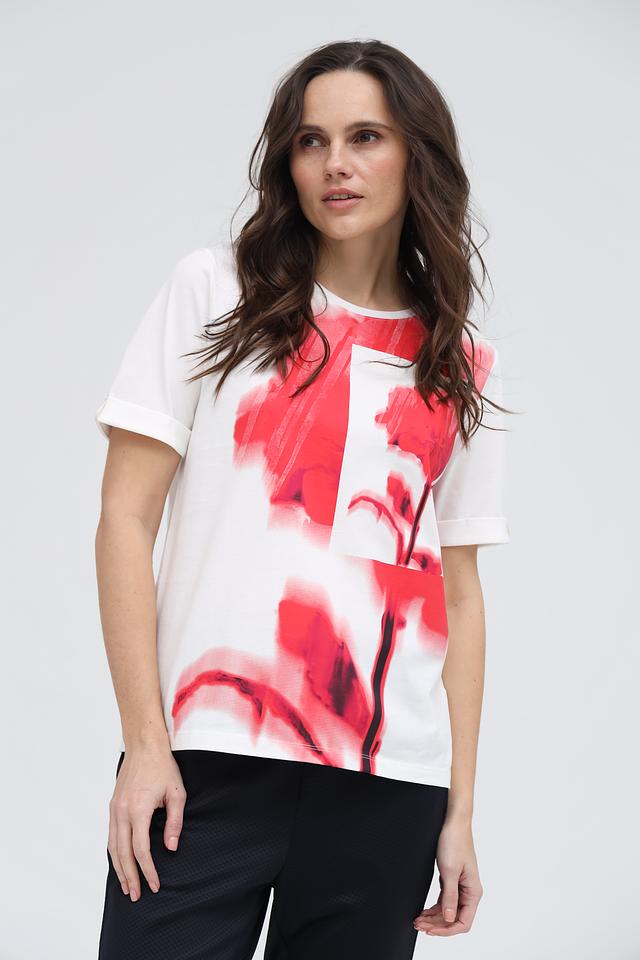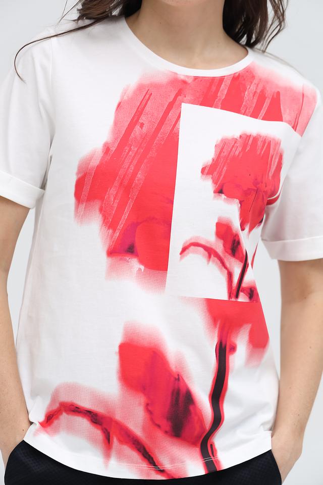 Основной цвет футболки – белый, а ярким акцентом служит абстрактный цветочный принт в оттенках красного. Принт расположен на передней части изделия и придает ему оригинальность и выразительность.