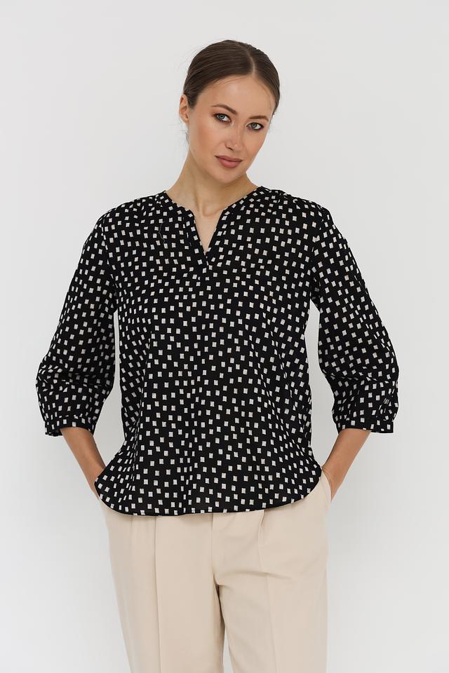 Особенностью данной модели является стильный принт в виде мелкого геометрического узора, сочетающего в себе чёрный и белый цвета. Эта блуза идеально подходит для создания как повседневных, так и более нарядных образов. Она хорошо сочетается с брюками, юбками и джинсами.