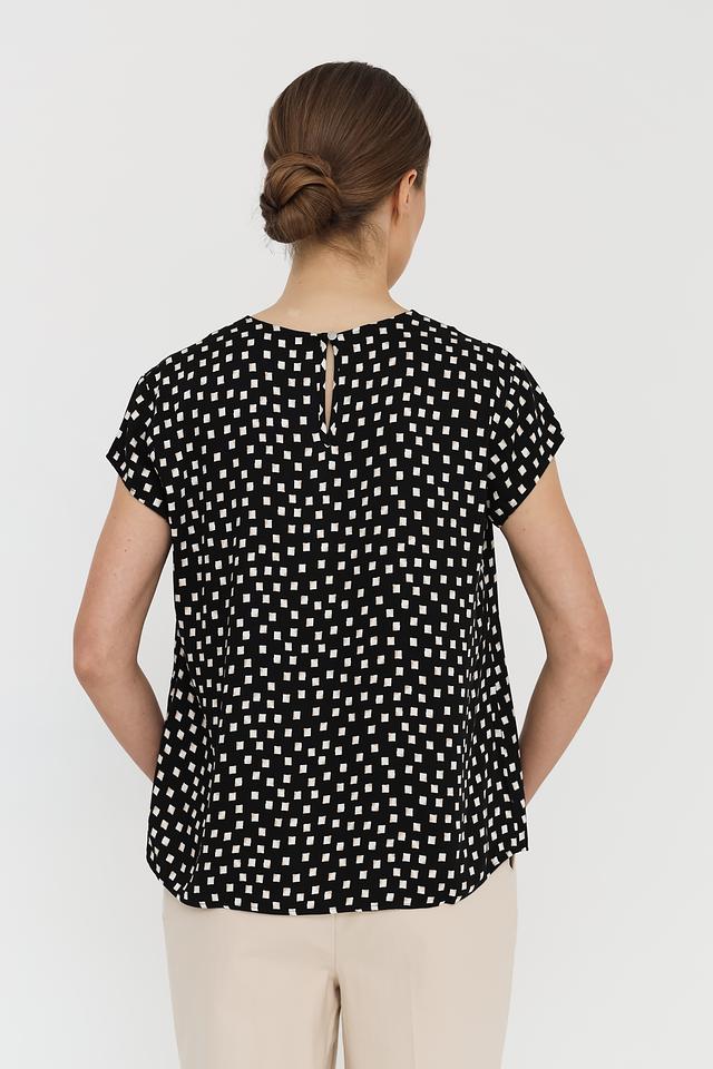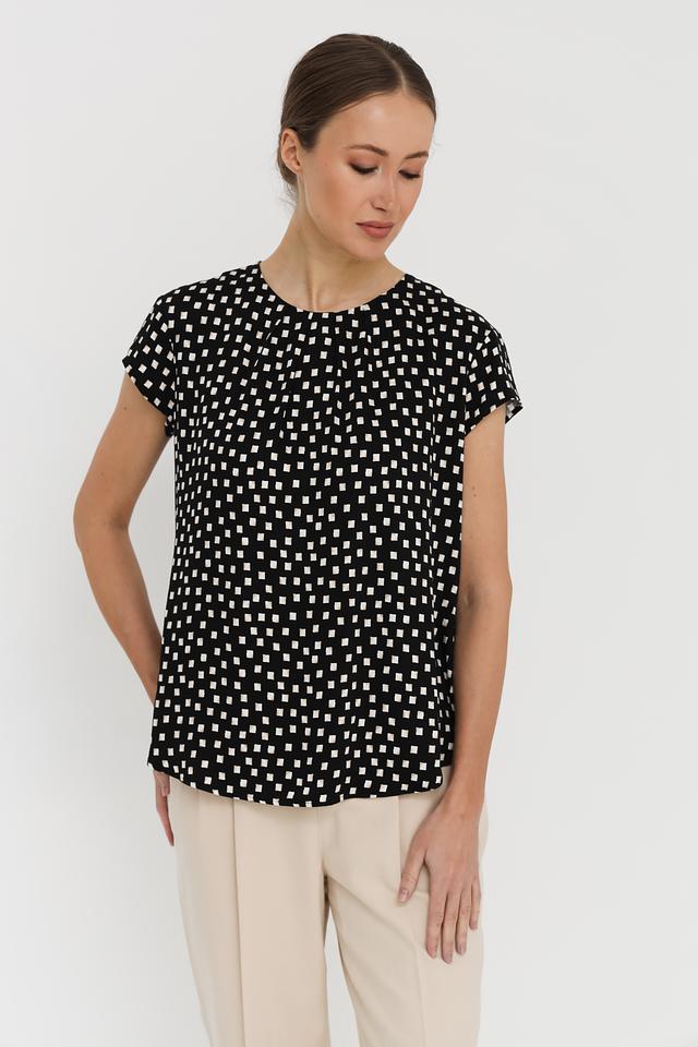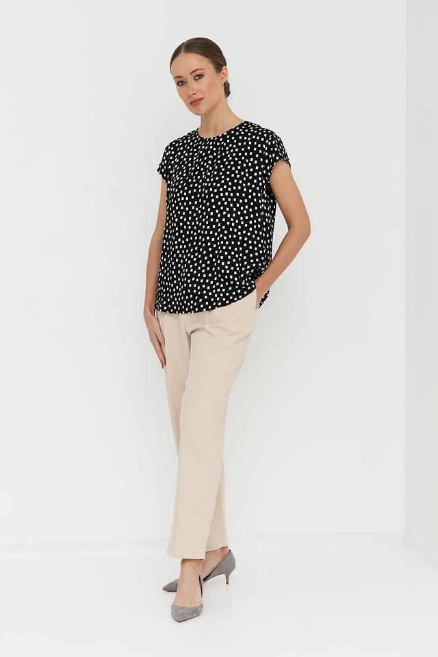 Блуза имеет классический крой с короткими рукавами и круглым вырезом горловины. Её украшает мелкий белый горошек на чёрном фоне, придающий ей игривый и женственный вид. Слегка приталенный силуэт подчеркивает достоинства фигуры, а свободный крой обеспечивает свободу движений.