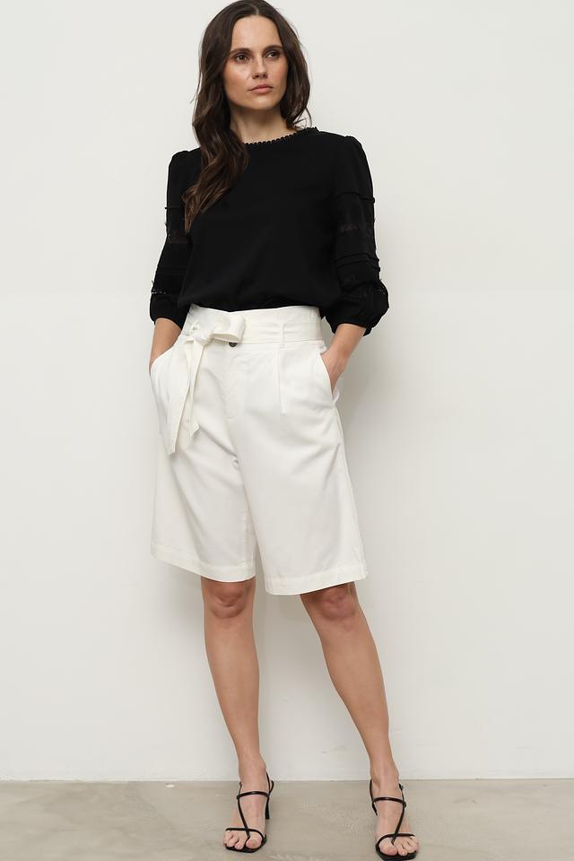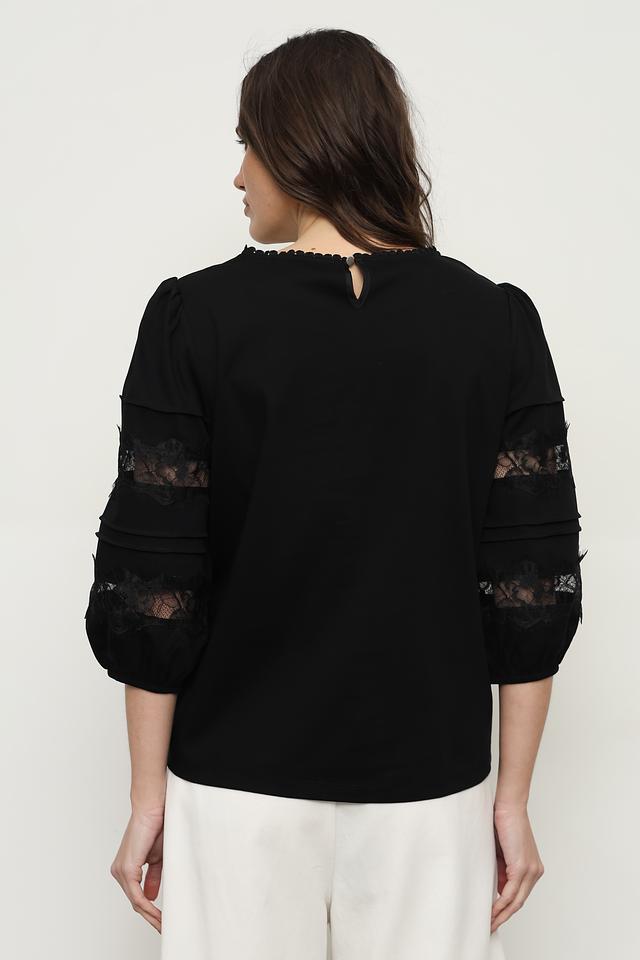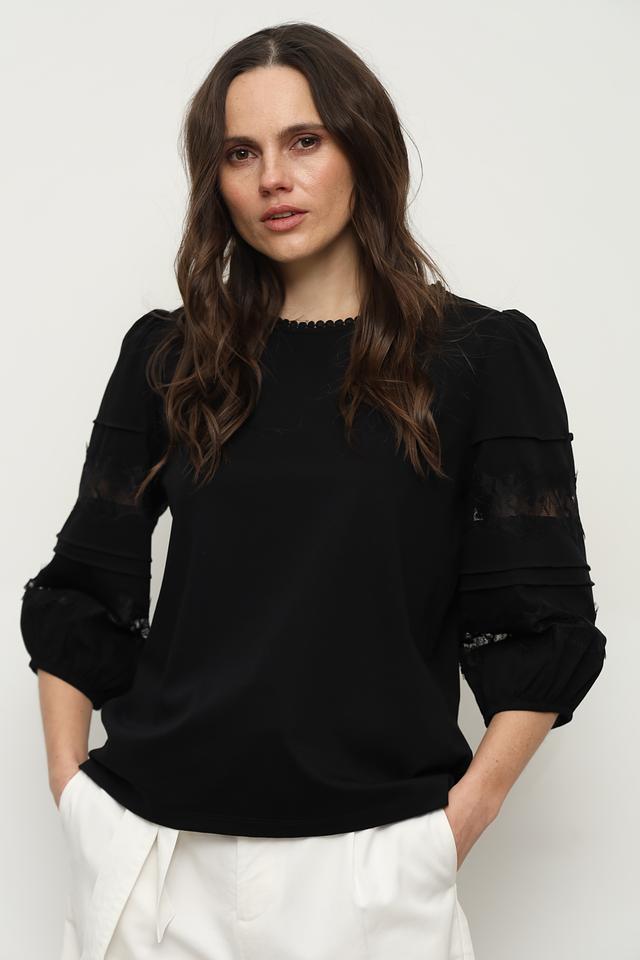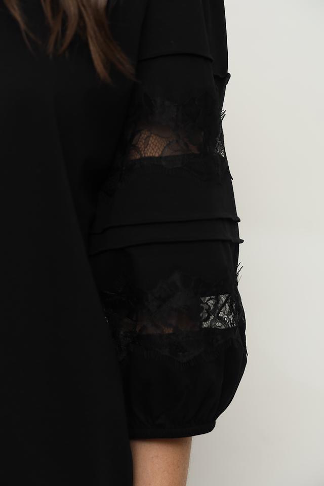 Блуза имеет классический чёрный цвет, который легко сочетается с различными элементами одежды. Рукава выполнены из изящного кружева, что добавляет образу романтичности и изысканности. Округлый вырез горловины и небольшая сборка по плечам создают женственный силуэт.