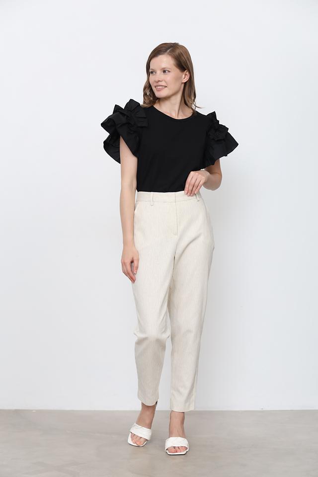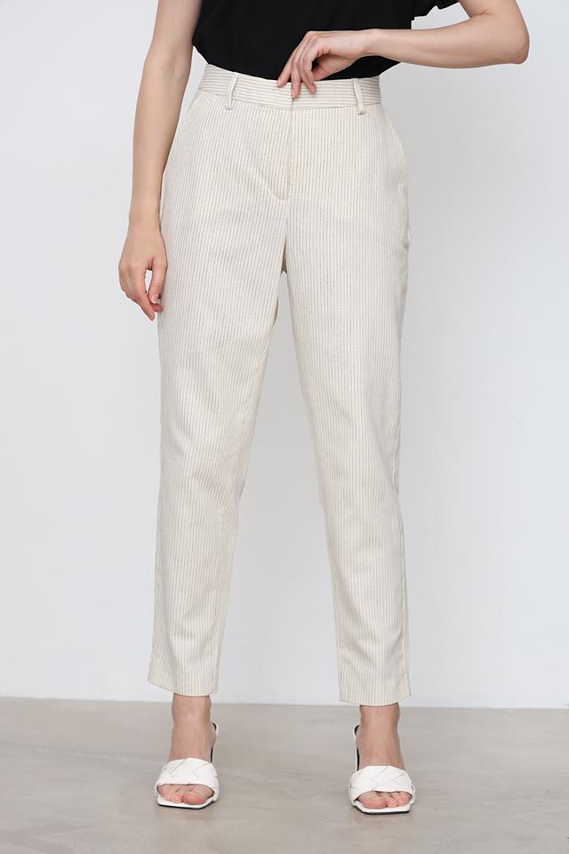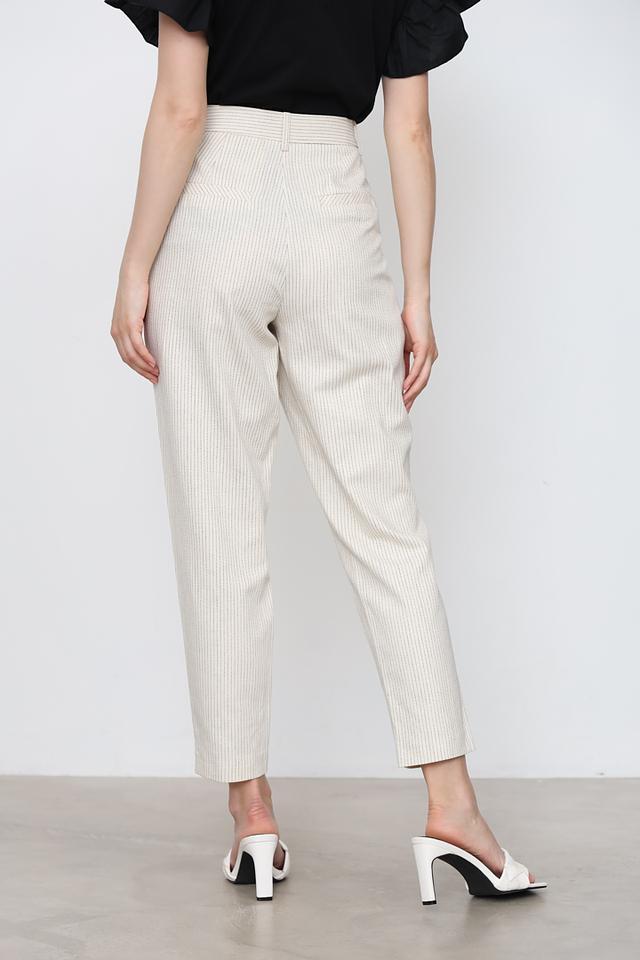 Брюки имеют классический крой с высокой посадкой и прямыми штанинами. Бежевый цвет в сочетании с тонкой полоской придает им элегантный и универсальный вид. Они легко сочетаются с различными топами, блузками и обувью, позволяя создавать разнообразные образы.