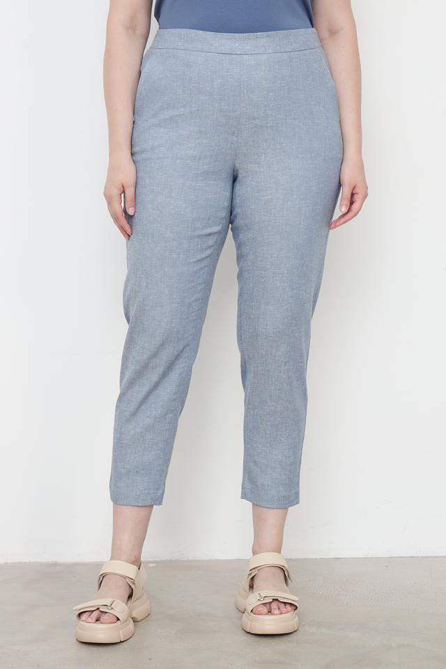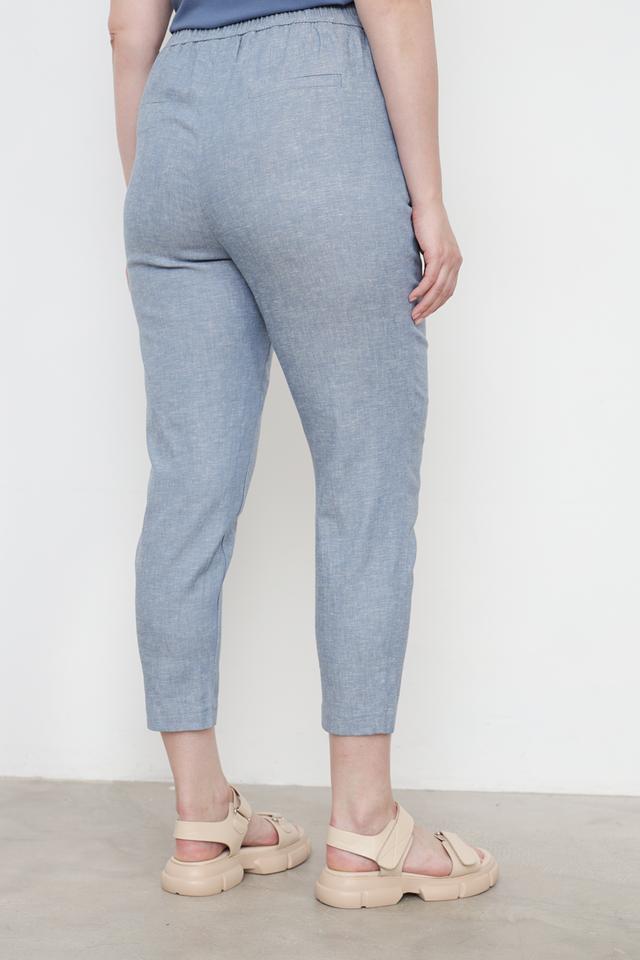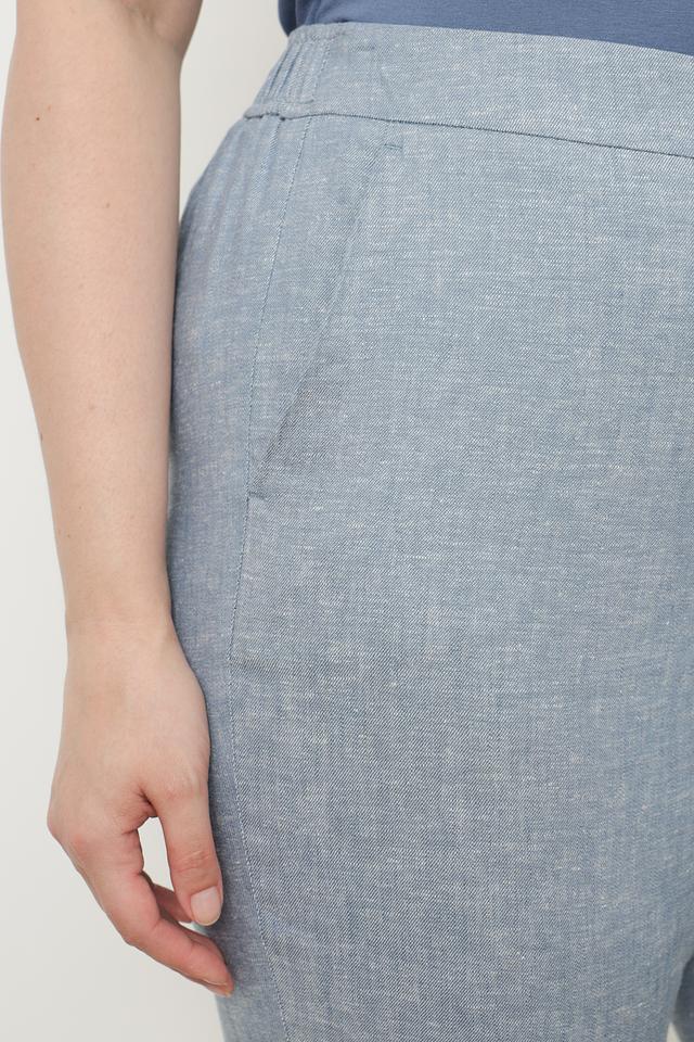 Женские брюки Taifun голубого цвета выполнены из натурального льна с добавлением вискозы и эластана. Модель имеет удобный эластичный пояс и слегка зауженный силуэт. Состав: лен 53%, вискоза 44%, эластан 3%