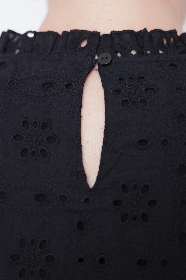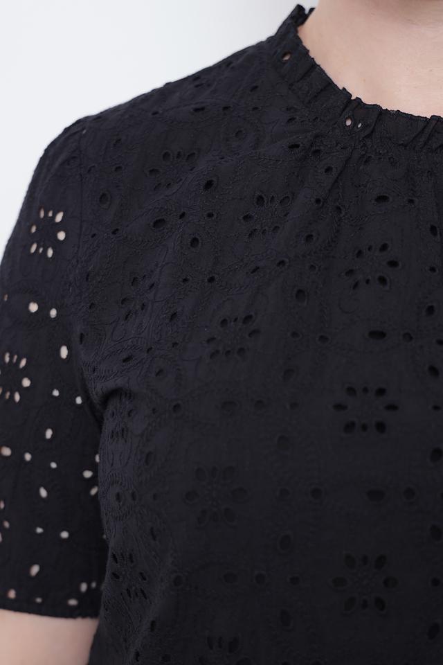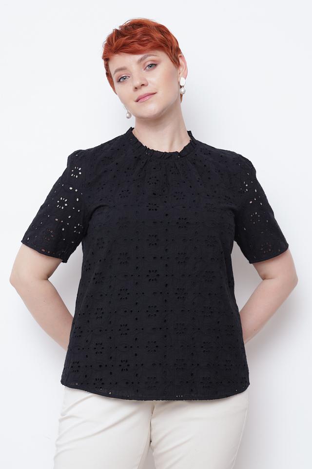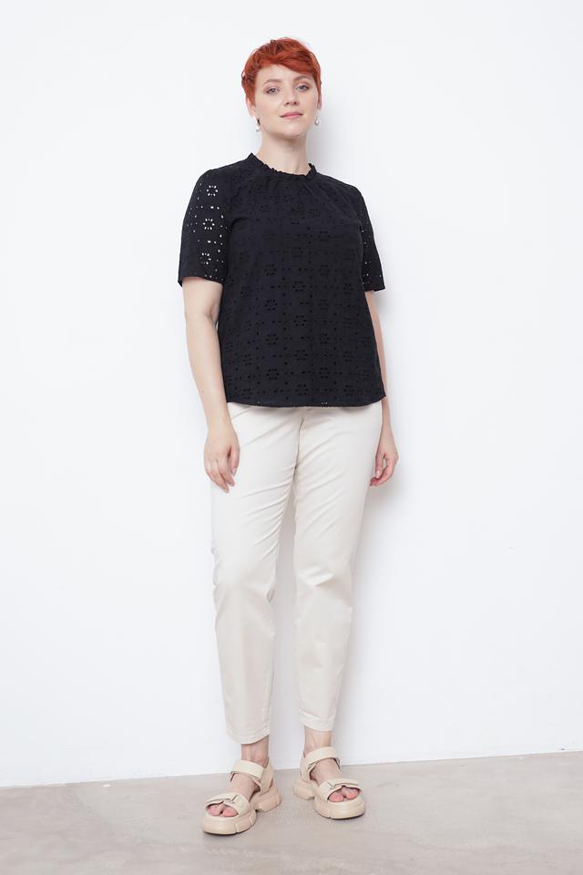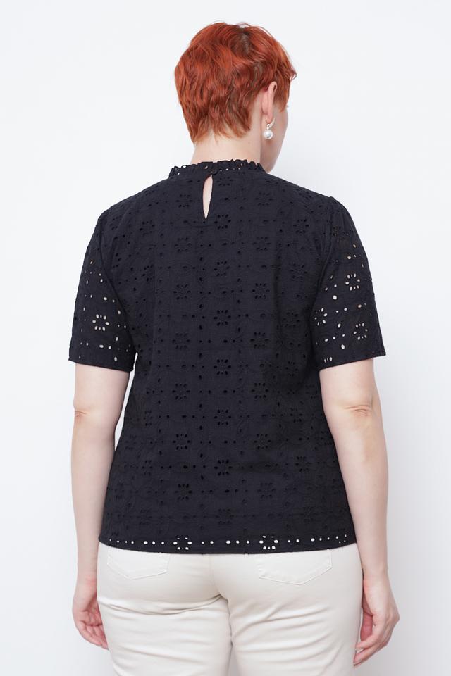 Эта элегантная блуза от Taifun выполнена в классическом чёрном цвете и украшена ажурной вышивкой "ришелье", придающей ей особый шарм.