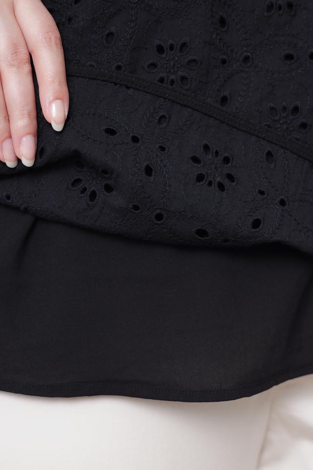 Чёрная блуза Taifun с изысканной вышивкой "ришелье" станет стильным дополнением к вашему гардеробу. Модель выполнена из 100% хлопка, что обеспечивает комфорт и воздухопроницаемость. Состав: хлопок 100%