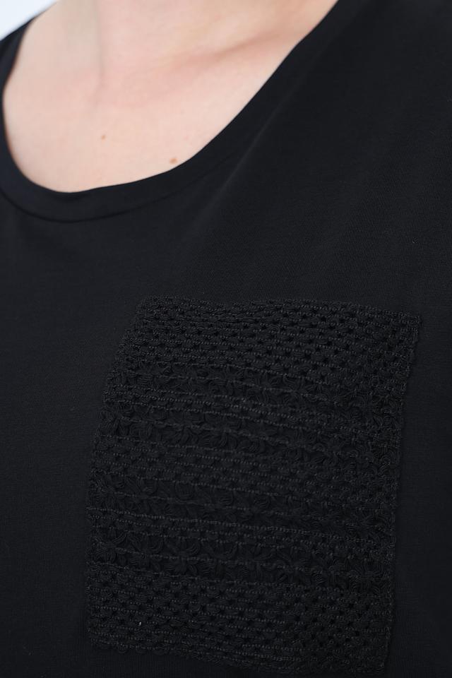 Модель имеет прямой крой, который обеспечивает комфортную посадку по фигуре. Короткий рукав и круглый вырез горловины делают футболку удобной в носке. На груди расположен декоративный карман, выполненный из текстурированной ткани, который добавляет изюминку в дизайн.