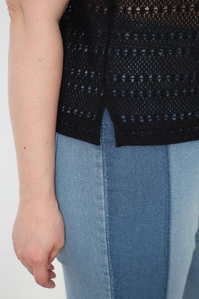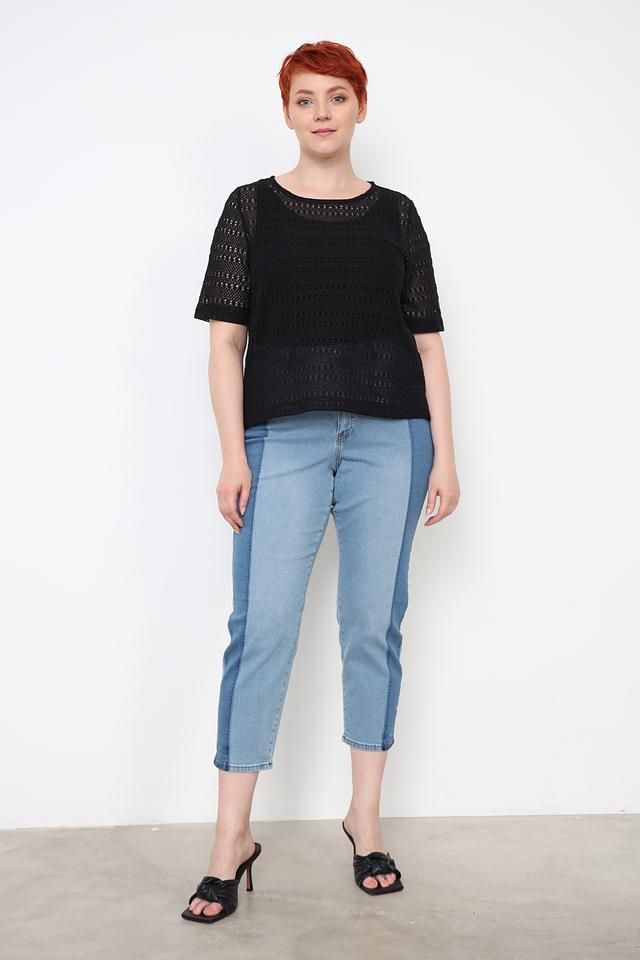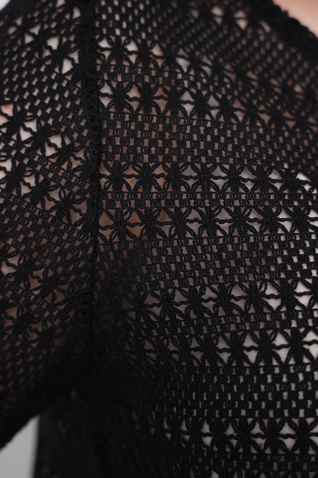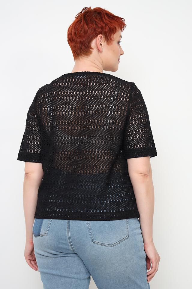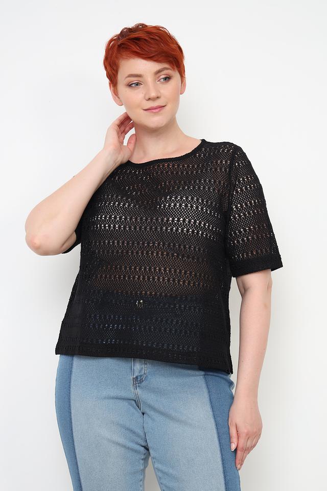 Особенностью данного пуловера является его ажурное плетение, которое придаёт ему лёгкость и воздушность. Короткие рукава и округлый вырез горловины делают его универсальным для различных образов.