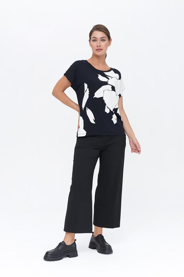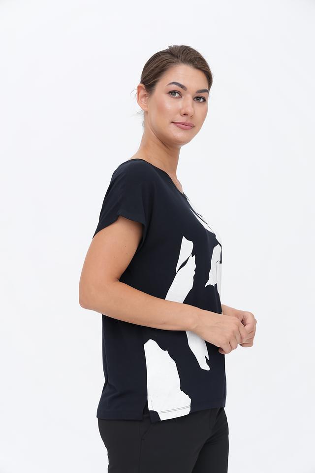 Женская футболка Taifun черного цвета с белым цветочным принтом – стильное и комфортное решение для повседневного гардероба. Изготовлена из мягкого модала с добавлением эластана, обеспечивающего удобную посадку. Состав: модал 95%, эластан 5%