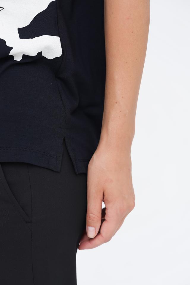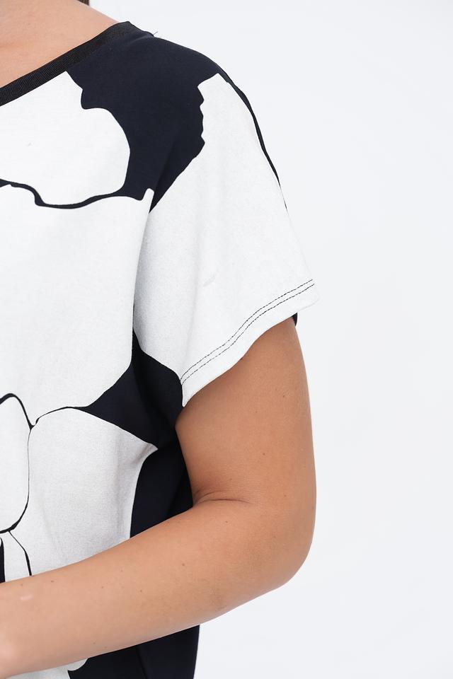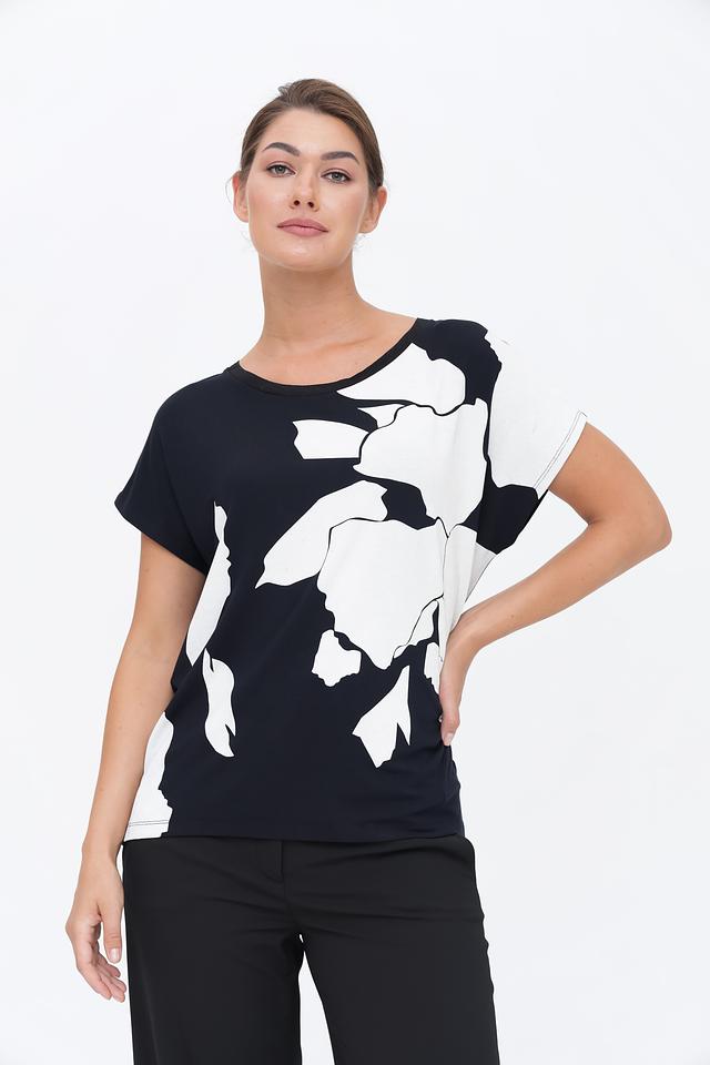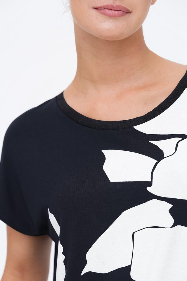 Основной цвет футболки – глубокий черный, который служит идеальным фоном для яркого белого цветочного принта. Рисунок выполнен в виде абстрактных лепестков, создающих легкий и романтичный образ.