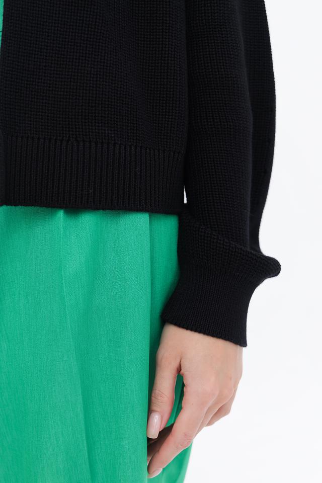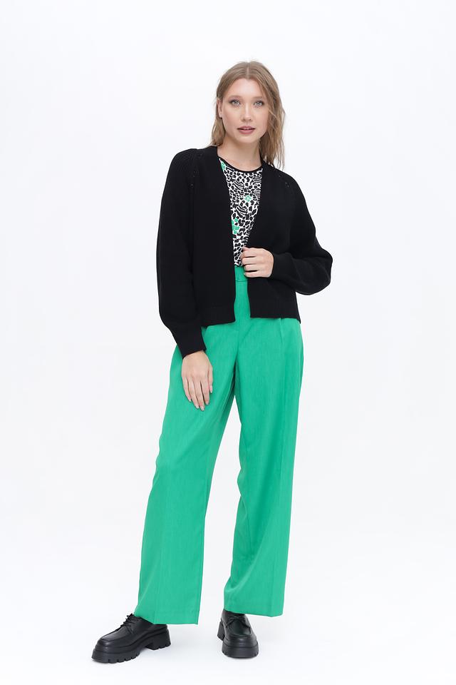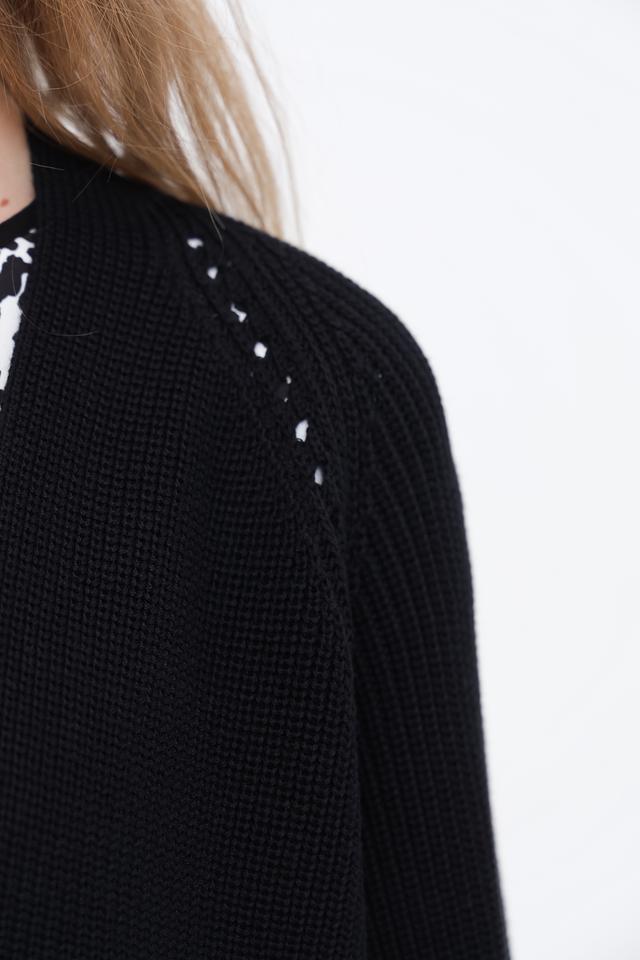 Модель имеет классический крой с V-образным вырезом и длинными рукавами-фонариками, которые придают образу женственность и лёгкость. Кардиган идеально подходит для создания многослойных образов и сочетается с различными стилями одежды.