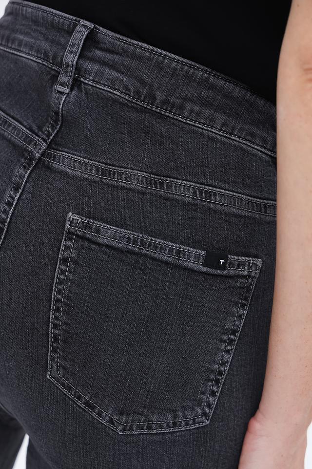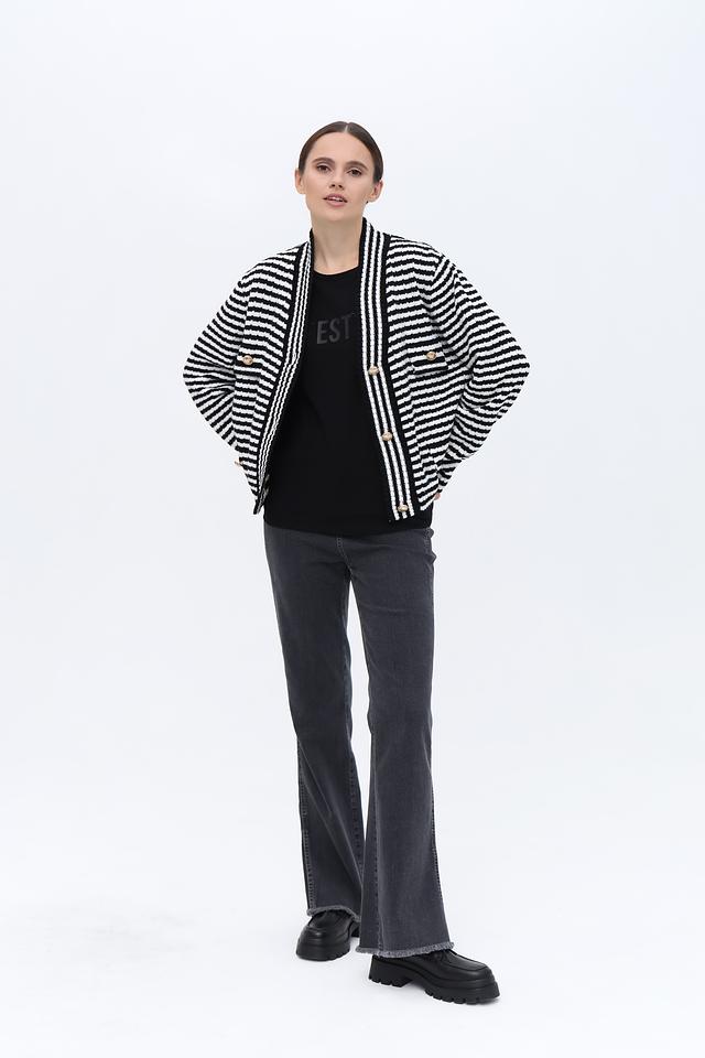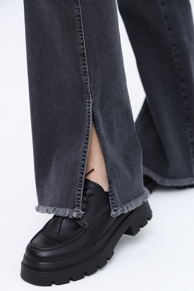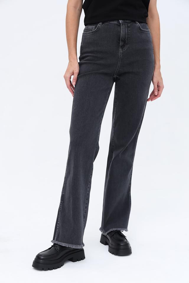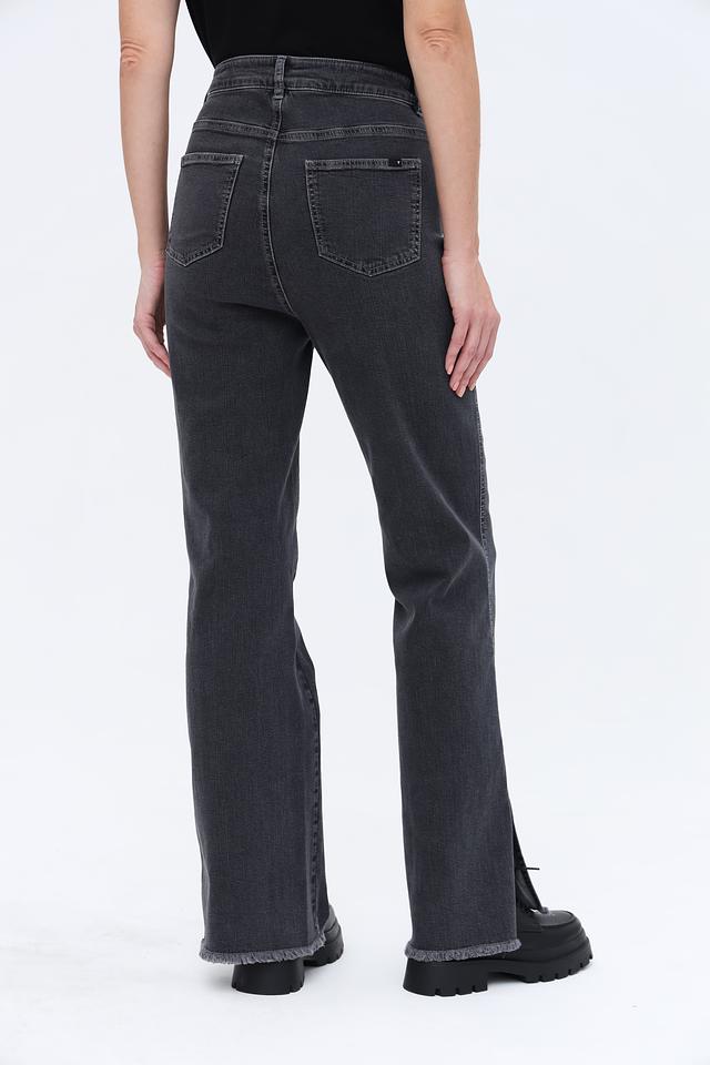 Джинсы имеют прямой крой и слегка расклешенный книзу фасон, что придает им современный вид. Оригинальным элементом дизайна являются разрезы по низу штанин, добавляющие образу легкости и динамики.