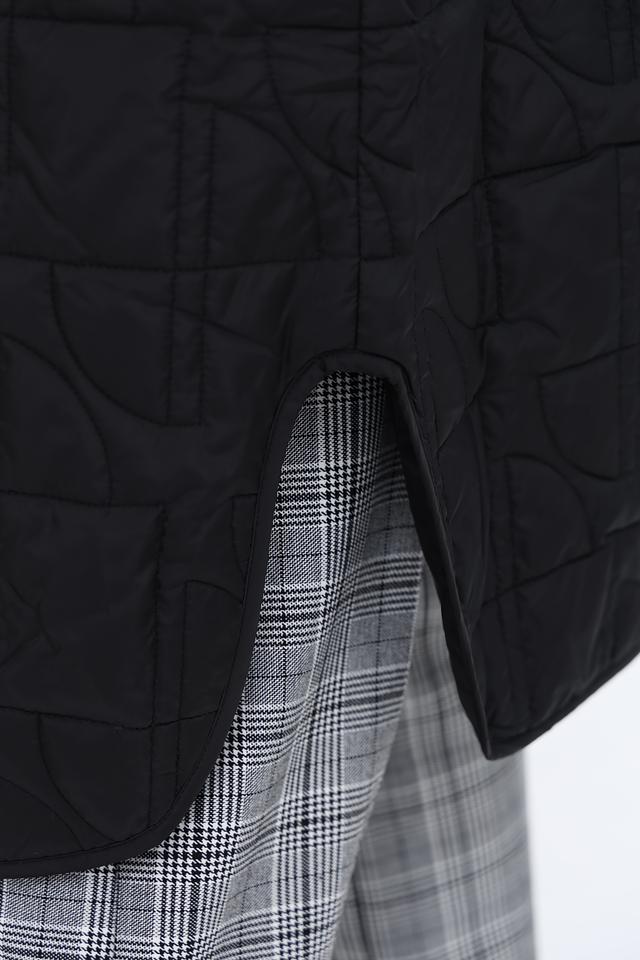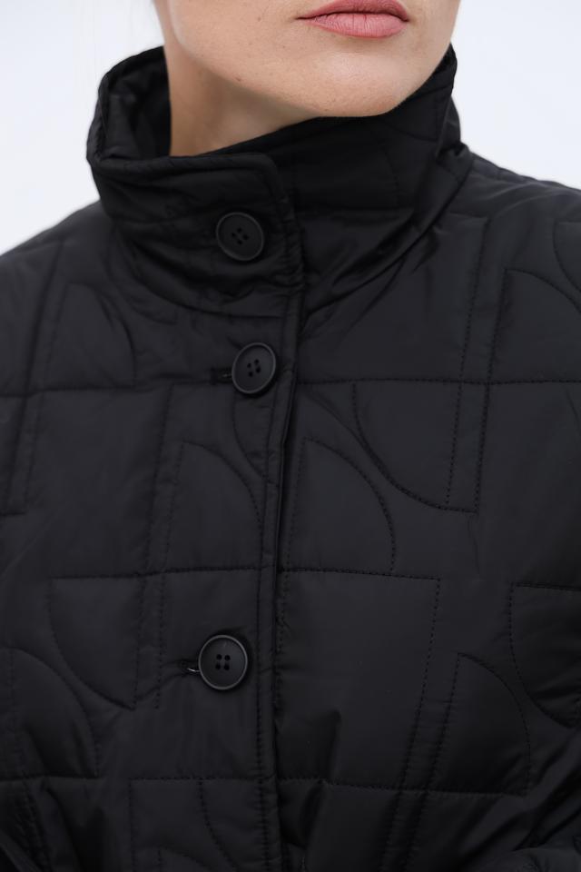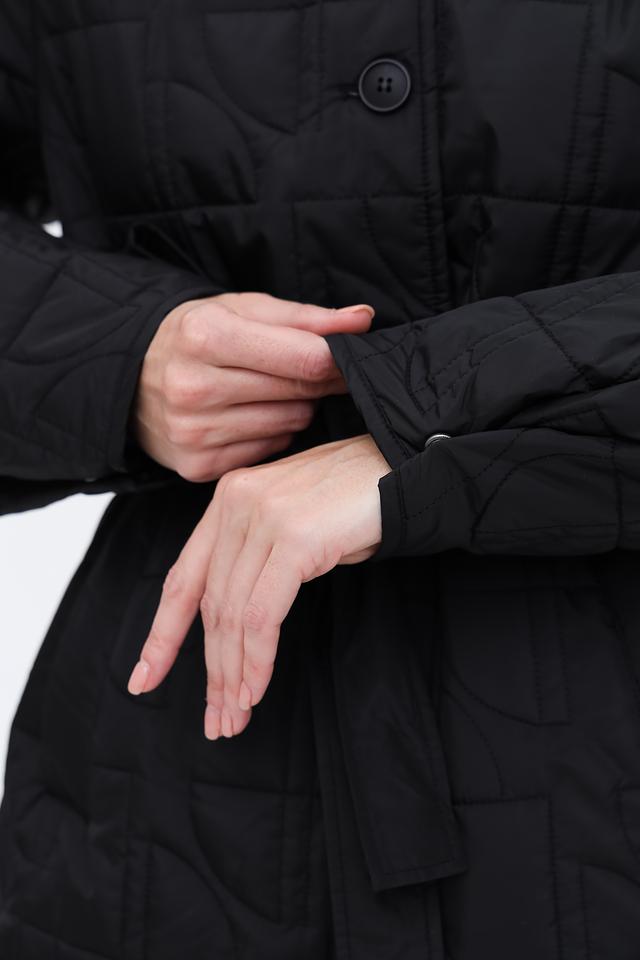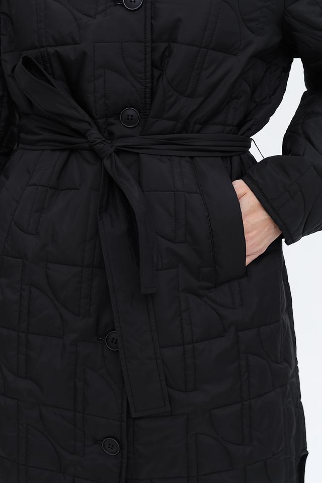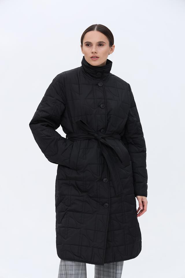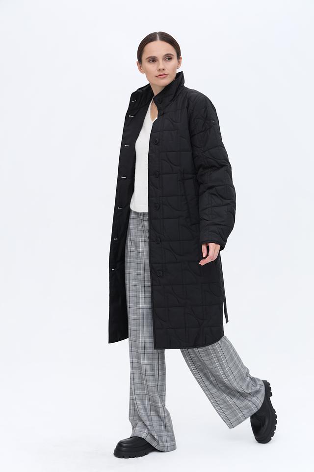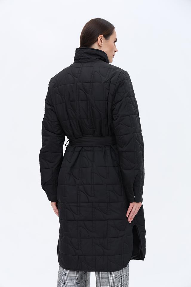 Особенностью данной модели является стеганая текстура, выполненная в виде геометрического рисунка. Пальто комплектуется поясом, который позволяет подчеркнуть талию и создать более женственный силуэт. Наличие боковых разрезов обеспечивает свободу движений.