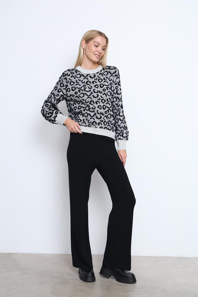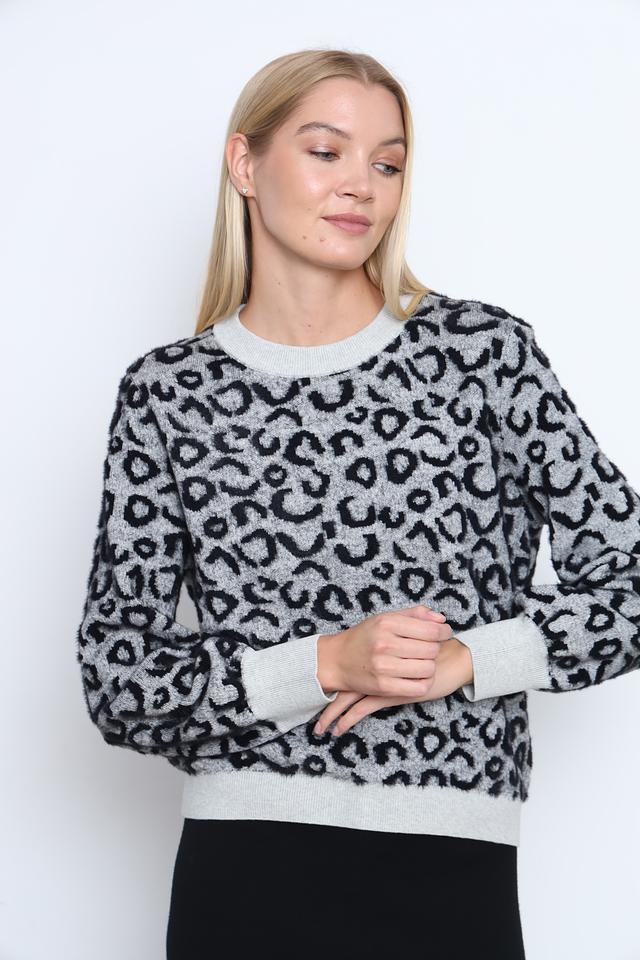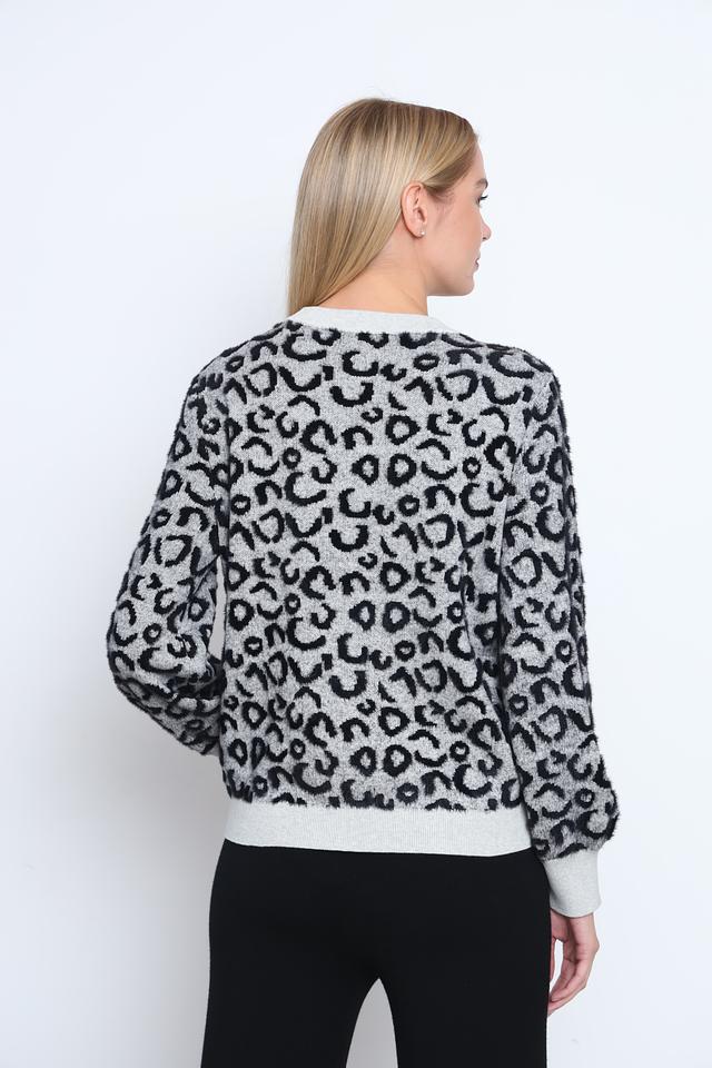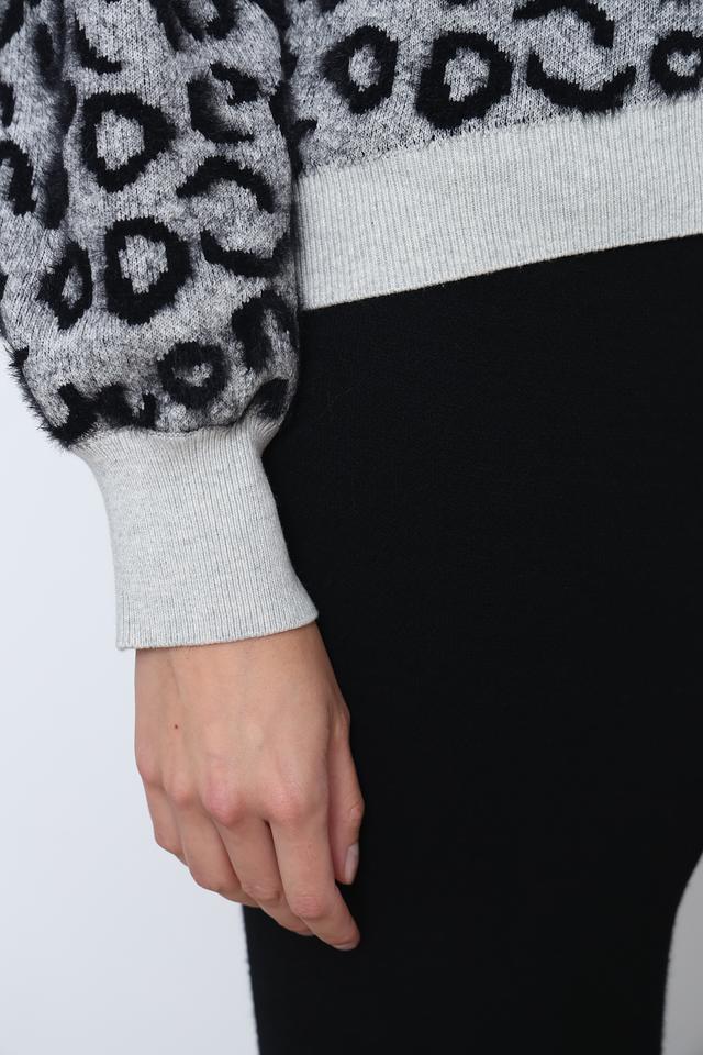Пуловер имеет свободный крой, который не сковывает движений и позволяет создать расслабленный силуэт. Округлый вырез горловины и длинные рукава с манжетами обеспечивают дополнительный комфорт. Основной цвет пуловера – серый, а ярким акцентом является эффектный леопардовый принт, который добавляет образу динамичности и оригинальности.