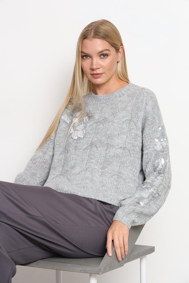 Модель имеет классический крой с круглым вырезом горловины и длинными рукавами. Особый акцент сделан на декоративные элементы – пайетки, которые расположены на плечах и рукавах, придавая изделию праздничный вид. Узор "косы" добавляет текстуры и объема.