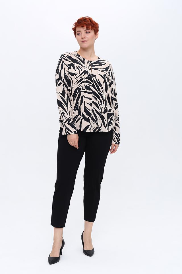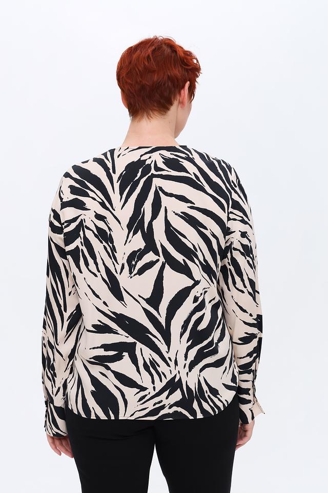 Эта блуза от Taifun – отличный выбор для создания элегантного и современного образа. Блуза выполнена в бежевом цвете с эффектным принтом, имитирующим шкуру зебры, что придает ей особую изюминку.