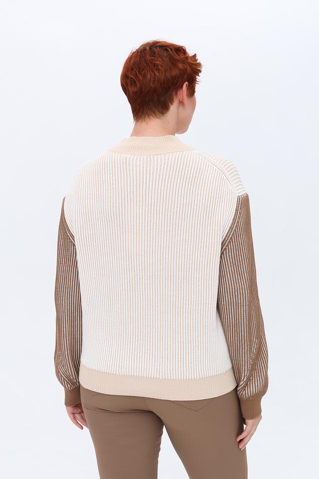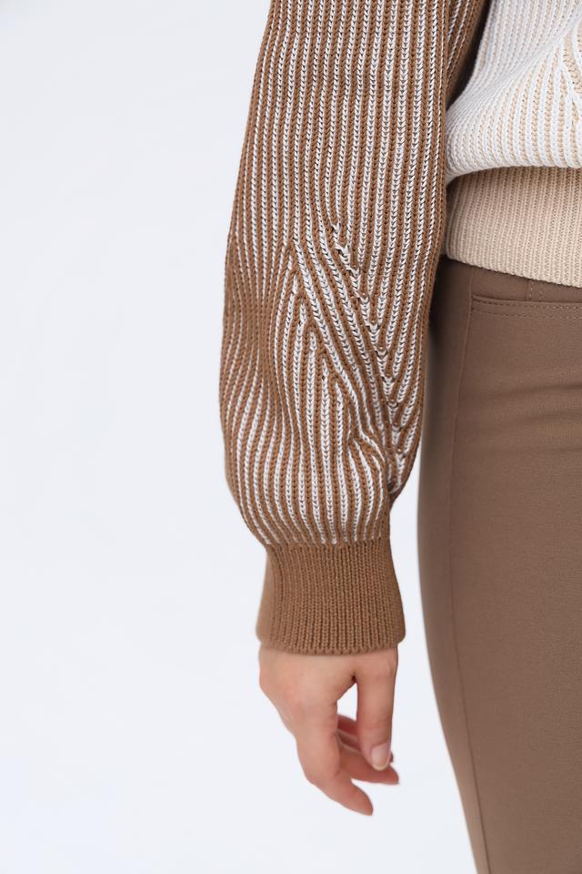 Пуловер имеет круглый вырез горловины и длинные рукава. Вертикальные полосы на рукавах визуально вытягивают силуэт, делая образ более изящным. Бежевый цвет легко сочетается с другими элементами гардероба, позволяя создавать разнообразные стильные образы.