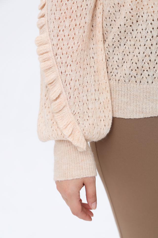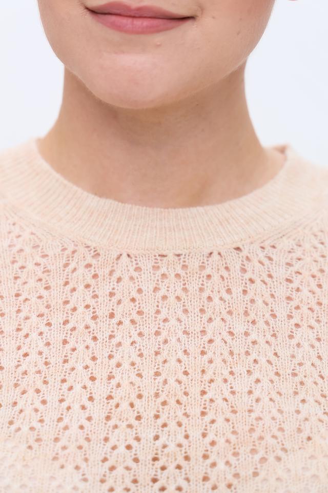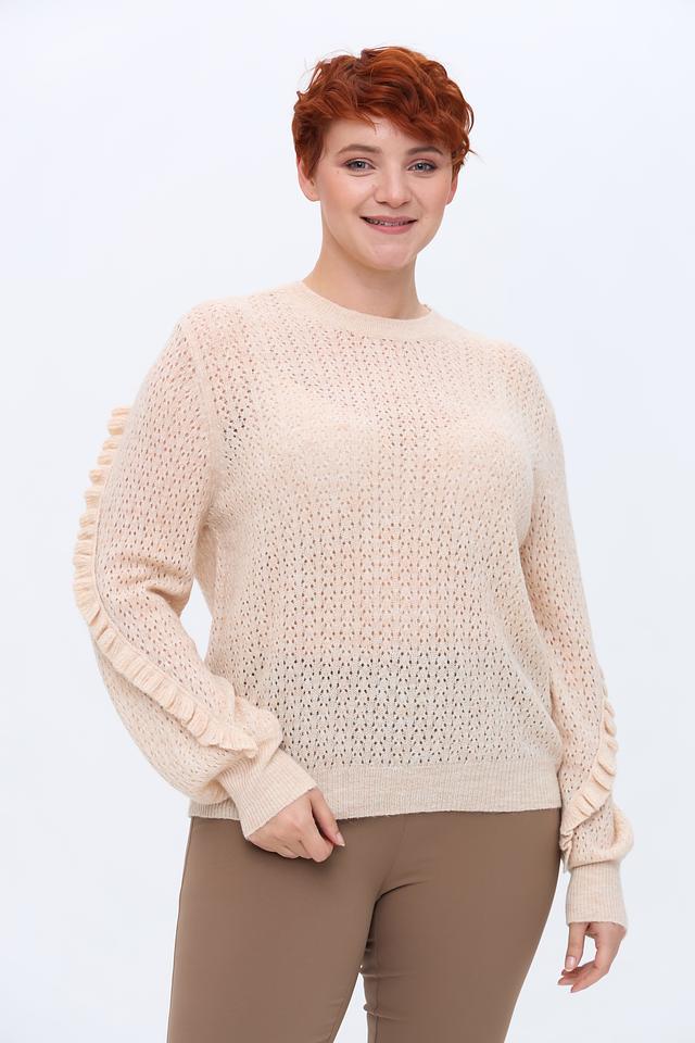 Пуловер имеет ажурный узор, который придает ему легкость и воздушность. Декоративные воланы на рукавах добавляют образу женственности и оригинальности. Круглый вырез горловины и свободный крой обеспечивают комфортную посадку по фигуре.