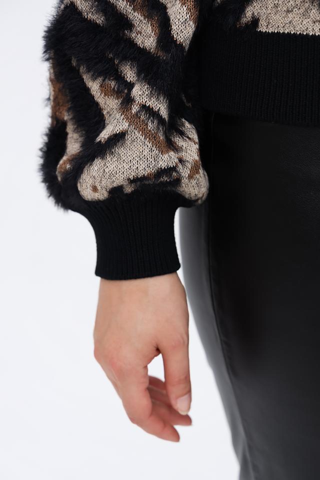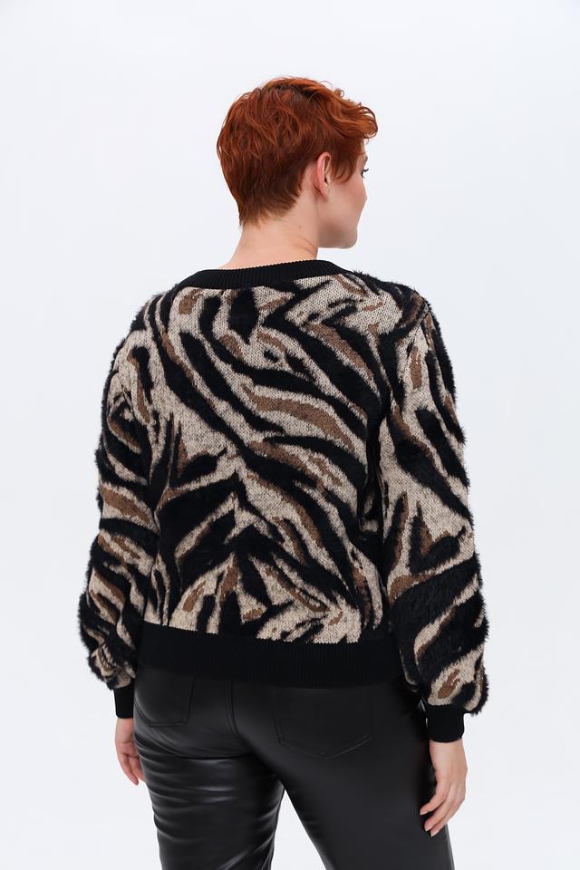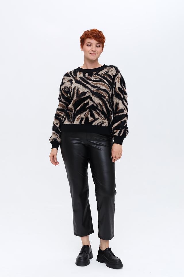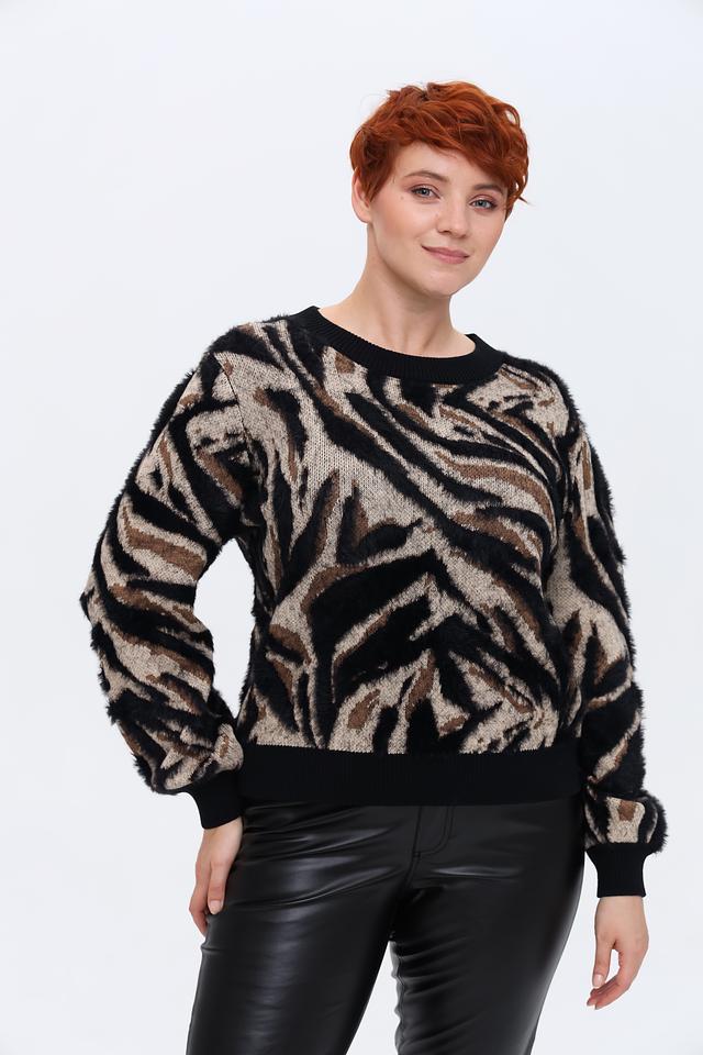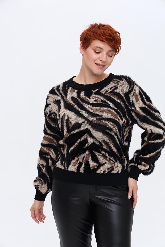 Этот стильный пуловер от Taifun – отличный выбор для создания модных и комфортных образов. Пуловер выполнен в оригинальном дизайне с принтом, имитирующим окрас зебры, сочетающим в себе чёрные, бежевые и коричневые оттенки.