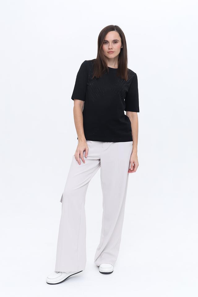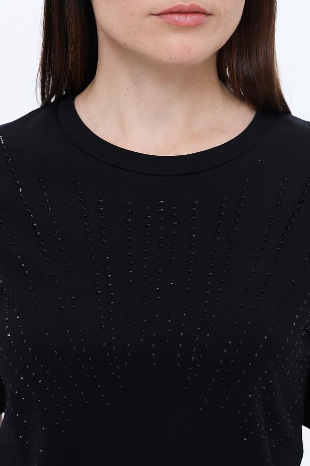 Основной цвет футболки – чёрный, который легко сочетается с любым гардеробом. Главная особенность модели – декор из мелких страз, расположенных в виде узора на передней части. Этот декор придает футболке изысканность и делает её подходящей для особых случаев.